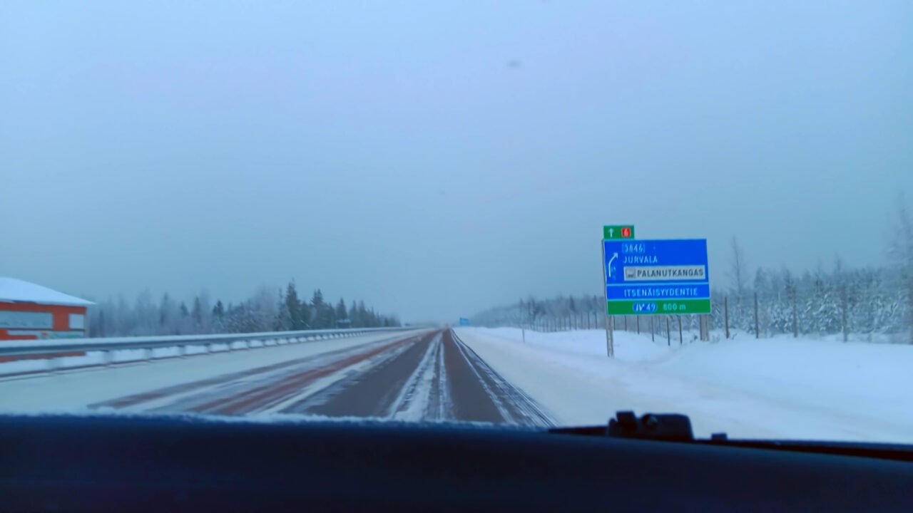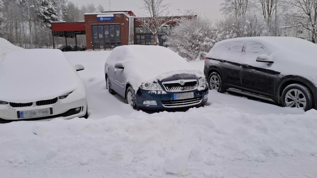 Auto oli hyvin piilotettu lumihankeen. Jonkun verran keulaa näkyi, mutta umpihangessa kuitenkin. Tässä kohtaa tuli mieleen, että autokauppa olisi voinut tarjota myös lumilapion. Vallin yli auton ovelle ja moottori käyntiin, jotta jäät sai laseista sulaksi. Kova työ oli potkia lumivalli sivuun auton edestä.