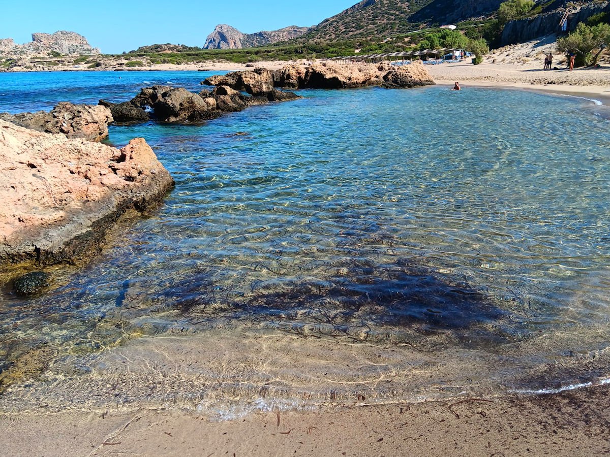 Vanhastaan muistin, että ennen Falassarnan arkeologista aluetta on ranta, jossa on suojainen laguuni. Vanha hippiranta. Tännekin oli tullut jo rantakahvila ja muita palveluja kuten aurinkovarjot ja -tuolit. Pysäköinti oli kuitenkin vielä ilmaista ja saapuessamme noin kello 10 oli myös rantakahvilan, Alea Beach barin ilmaisella parkkipaikalla hyvin tilaa. Ei tarvinnut kävellä alamäkeen eikä rannalla olon jälkeen kovassa helteessä ylämäkeen.