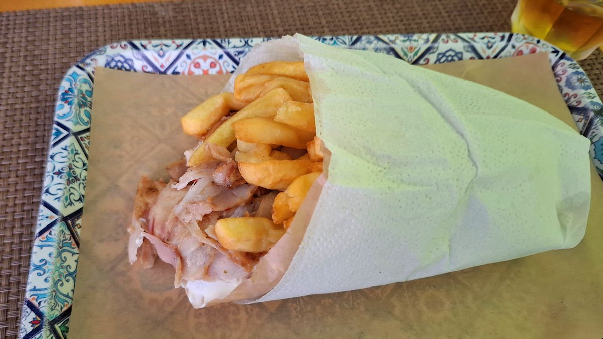 Iltapäivän päivällinen oli tällä kertaa normikokoinen gyros pita ja ranskalaiset. 2 dl valkoviiniä ja 0,33 Amstel maksoivat yhteensä 5 €. Oli ilo kävellä takaisin rantaa pitkin hotellille sillä ilta oli viileämpi kuin edellisinä päivinä. Taisi olla “vain” 28 astetta.