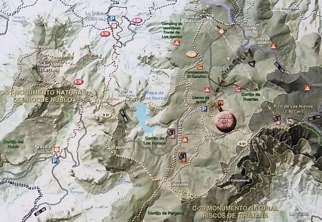 Autolla jatketaan GC-600:sta aina Cruz de Los Llanosin T-risteykseen, jossa käännytään oikealle GC-130:lle. Noin kahden kilometrin jälkeen tullaan jälleen t-risteykseen, josta käännytään GC-134:lle. Matkalla on muistettava kääntyä sotilasalueen portin kohdalla oikealle, sillä vasemmalle kääntyminen ohjaa sotilasalueelle. Oikealle kääntyvä tie vie suoraan Pico de Las Nievesin näköalapaikalle. Täällä on pienehkö kääntöpaikka ja muutaman auton pysäköintialue. Itse jätin auton tien viereen hieman ennen sotilasaluetta. Siinä oli guanchien lumikaivo. Alkuasukkaat keräsivät kaivoon talvella lunta ja jäätä, sillä tulivuoren purkaustuoteet ovat hyvää eristettä ja ylhäällä rinteessä viileämpää kuin meren rannalla. Lumi säilyi kesän yli kaivossa josta se jaettiin kyläläisten kesken. Kaivo ei ole kovin merkillinen. Lähinnä isompi hiidenkirnu. Tästä on matkaa noin 800 metriä Gran Kanarian korkeimalle kohdalle ja myös Pico de Las Nievesin näköalapaikalle.
