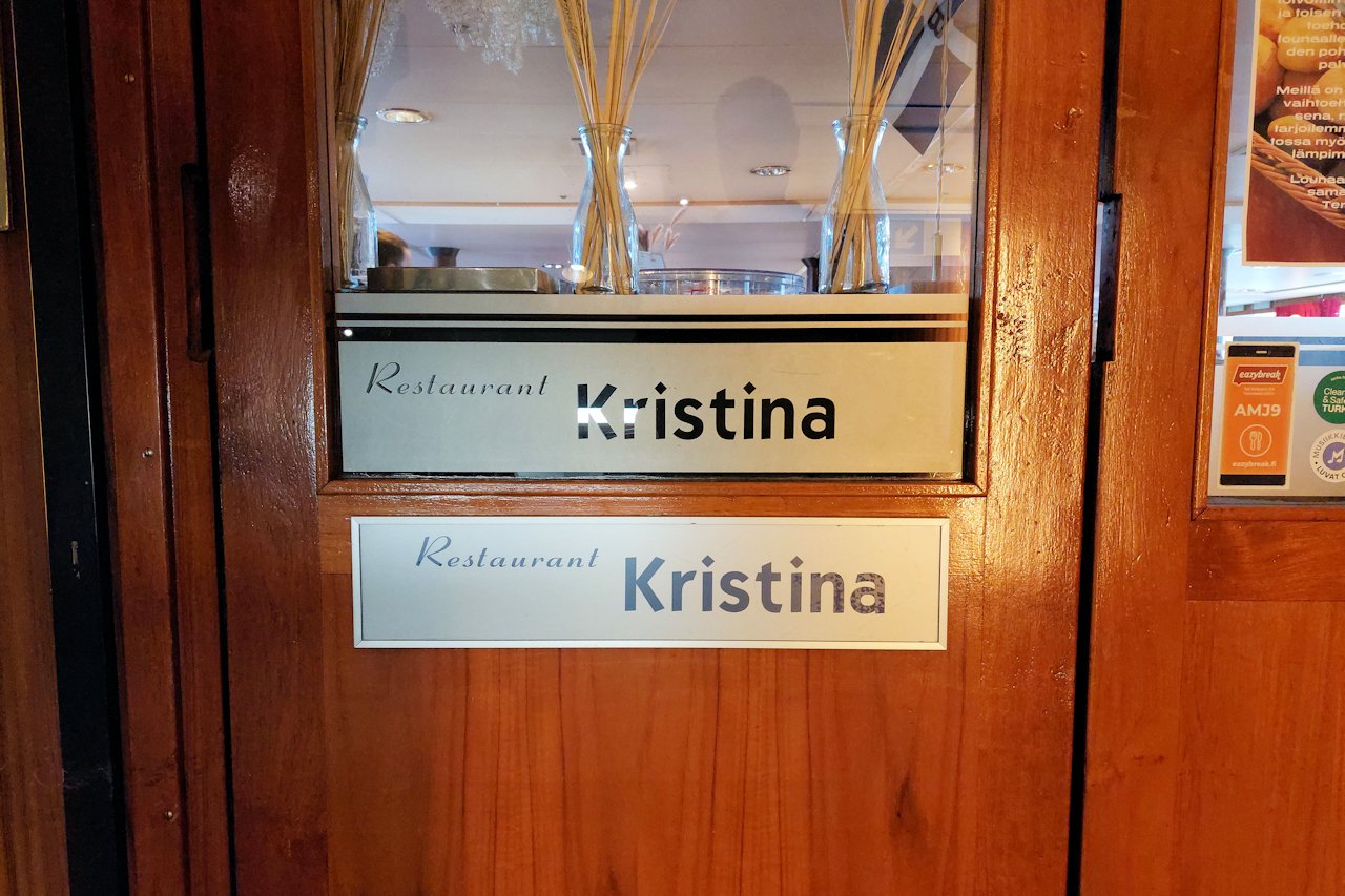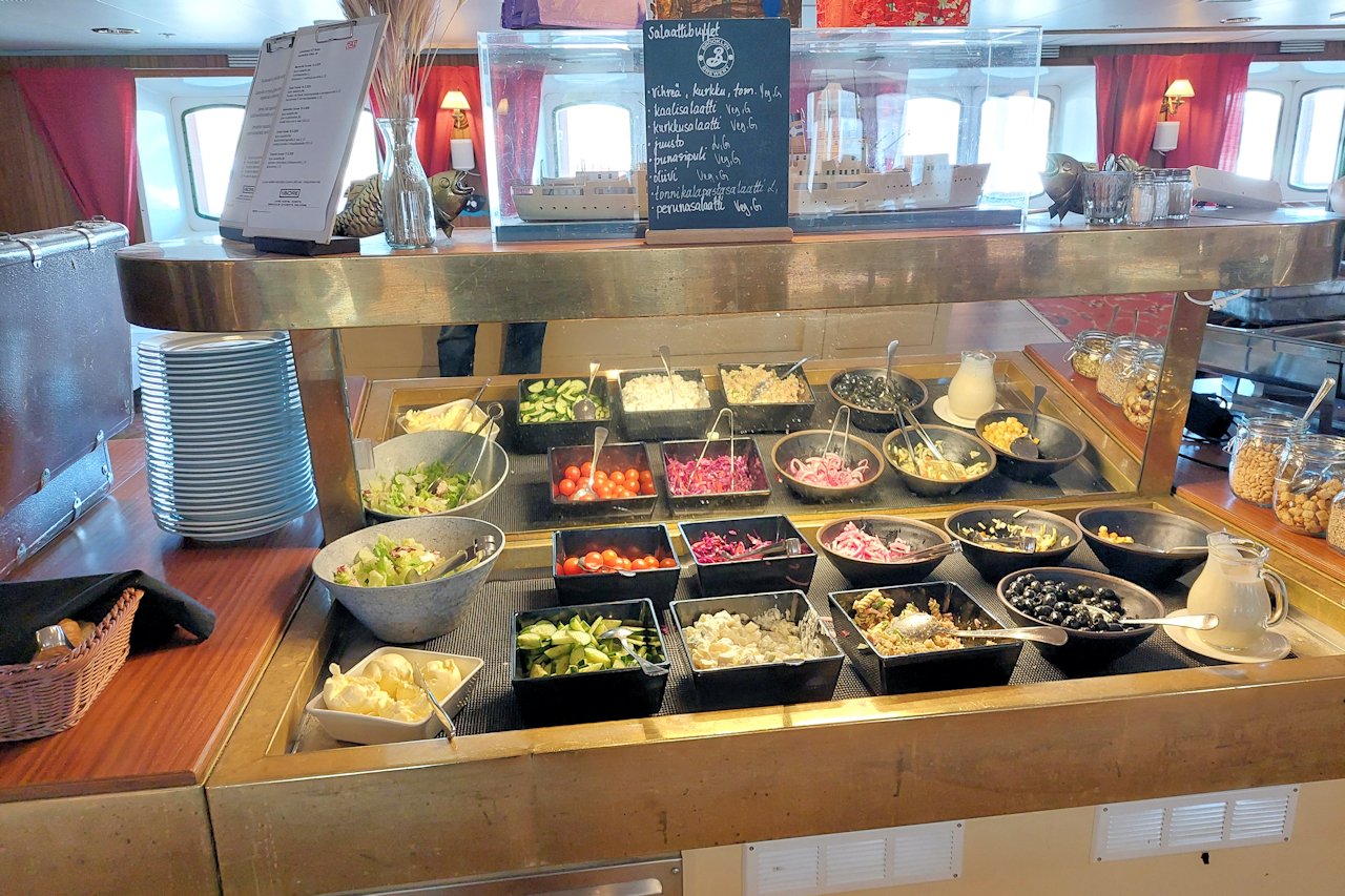 Vastaanottoa vastapäätä, puoli kerrosta ylempänä on aamiais- ja lounasravintola Kristina. Lounas tarjoillaan kello 11 -14. Emme ehtineet lounaalle ja toisaalta lähdimme paluumatkalle ennen kello 11, joten tällä kertaa lounaspöytä jäi arvostelematta. Kuvasin kuitenkin lounassalaatin ovelta.