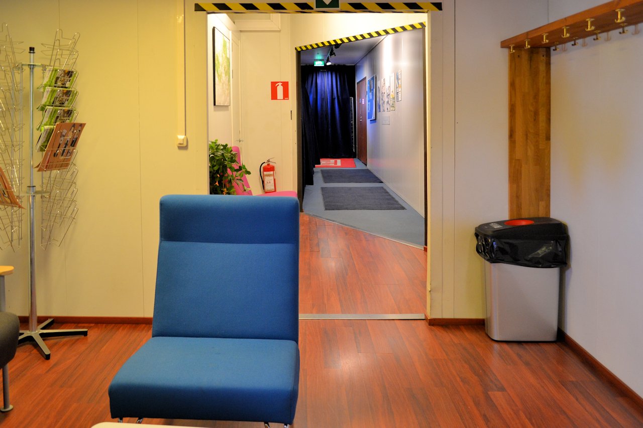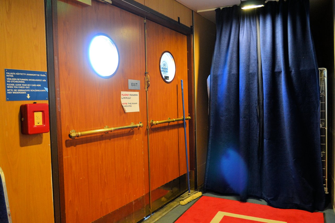 Hostellin vastaanotto on kannella neljä. Sinne kuljimme ramppia pitkin satamasta. Onneksi ei ollut kovin paljon tavaraa, sillä ramppi on melko kapea. Hieman paremmin olisi viitoitus voinut olla, sillä vanha autoramppi houkutteli isommalla koollaan. Ohjeistus on kuitenkin kapeaa ramppia pitkin ylös 4. kannelle.