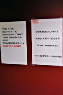 Harmillisesti käyntimme sattui aikaan, jolloin kumpikin saunoista oli remontissa eli hintaan kuuluva aamusauna jäi tällä erää kokematta. Ulkokansikin oli pääosin suljettu. Ilmeiseti kansipaneeleja ja puupenkejä kunnostetaan tulevaa kesää varten. Kaiken pitäisi olla kuitenkin kunnossa kesän ensivieraiden saapuessa S/S Boreen.