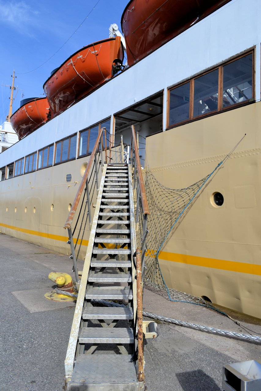 Poistuimme laivan takaportaita pitkin. Se olikin jonkin asteinen kokemus. Kapea portaikko, jonka jokainen askelma keinui. Onneksi oli tasapainohermot kunnossa.