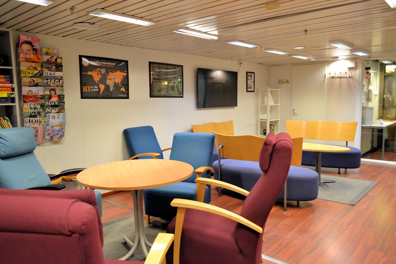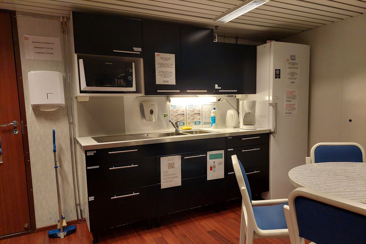 Vastaanoton aulasta pääsi portaita alas kolmannelle kannelle, jossa sijaitsivat oleskelutilat ja keittiö entisessä tax-free myymälässä. Varsin moni kävijä oli jättänyt kirjoja hyllyyn, joten aikaa saa kulumaan myös kirjallisuuden parissa. Toki tilassa oli myös taulutelevisio. Oleskelutilan vieressä oli pieni jääkaapillinen yhteiskeittiö sekä roska-astioita jätteiden lajitteluun. Testasin yhdellä kinkku-juustoleipäpaketilla pysyykö tuotteet jääkaapissa, vai maistuuko nälkäisemmälle. Ainakin tällä kertaa eväs säilyi.