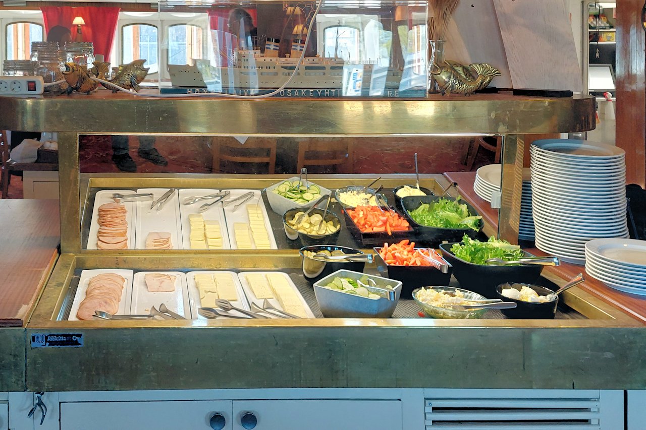 Vastaanottoa vastapäätä, puoli kerrosta ylempänä on aamiais- ja lounasravintola Kristina. Lounas tarjoillaan kello 11 -14. Emme ehtineet lounaalle ja toisaalta lähdimme paluumatkalle ennen kello 11, joten tällä kertaa lounaspöytä jäi arvostelematta. Kuvasin kuitenkin lounassalaatin ovelta.