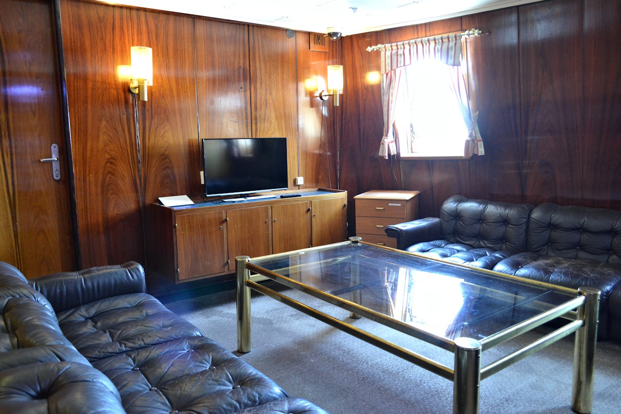 Hytti oli yhdistetty kahdesta alkuperäisestä hytistä. Tai ainakin ajattelin niin. Kaksi huonetta eli makuuhuone ja oleskelutila. Oleskelutilan yhteydessä oli WC ja makuuhuoneen puolella suihku. Tilat olivat hyvässä kunnossa ja siistit. Vuodevaatteet ja pyyhkeet odottivat vuoteiden päällä. Täällä piti itse pedata vuode. En ole aiemmin ollut hostelleissa, joten en tiedä onko se yleinen tapa. Kun repuissa kulkeneet muutamat vaihtovaatteet olivat kaapeissa lähdimme tutustummaan tarkemmin S/S Boreen.