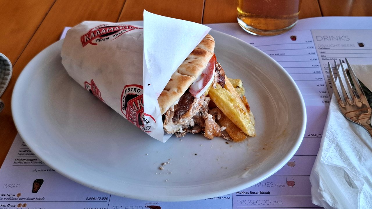 Rantabulevardilla nautin myös pienen lounaan. 30 asteen lämpötila ajoi varjoisaan ravintolaan. Lounaspaikkani tällä kerralla oli Kalamaki Bar. Se tarjoaa perinteistä kreikkalaista ja kyproslaista ruokaa. Hintaa Pork Gyros pitalle kertyi 5,90 €.
