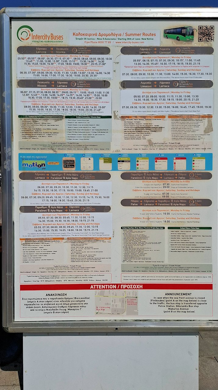 Rantabulevardilla on myös bussipysäkki, josta lähtevät paikallisbussit ja kaupunkien väliset intercitybussit, jotka eivät pysähdy kaikkilla pysäkeillä. Intercityn lippujen hinnat ovat hieman korkeampia kuin paikallisbussien, mutta Pafosiin, Agia Napaan, Protarakseen, Limassoliin ja Nikosiaan ovat matkat huomattavasti nopeampia. Lentoasemalle mennään paikallisbussilla. Toki sinne on lyhyt matka eli taksimatka maksaa noin 20€. Taksin käytössä Kyproksella on varauduttava käteisen käyttöön. Suurin osa takseista ei vastaanota korttimaksua.