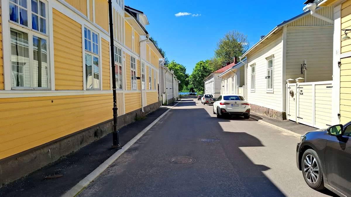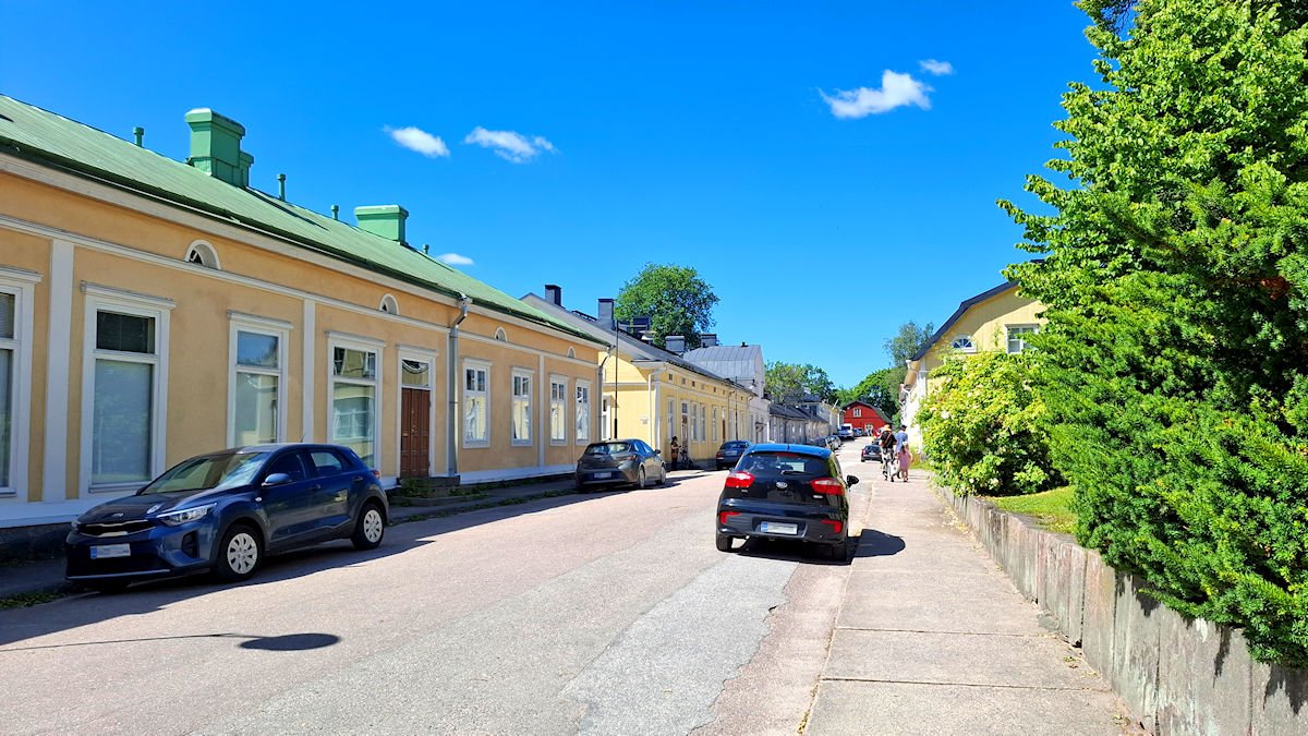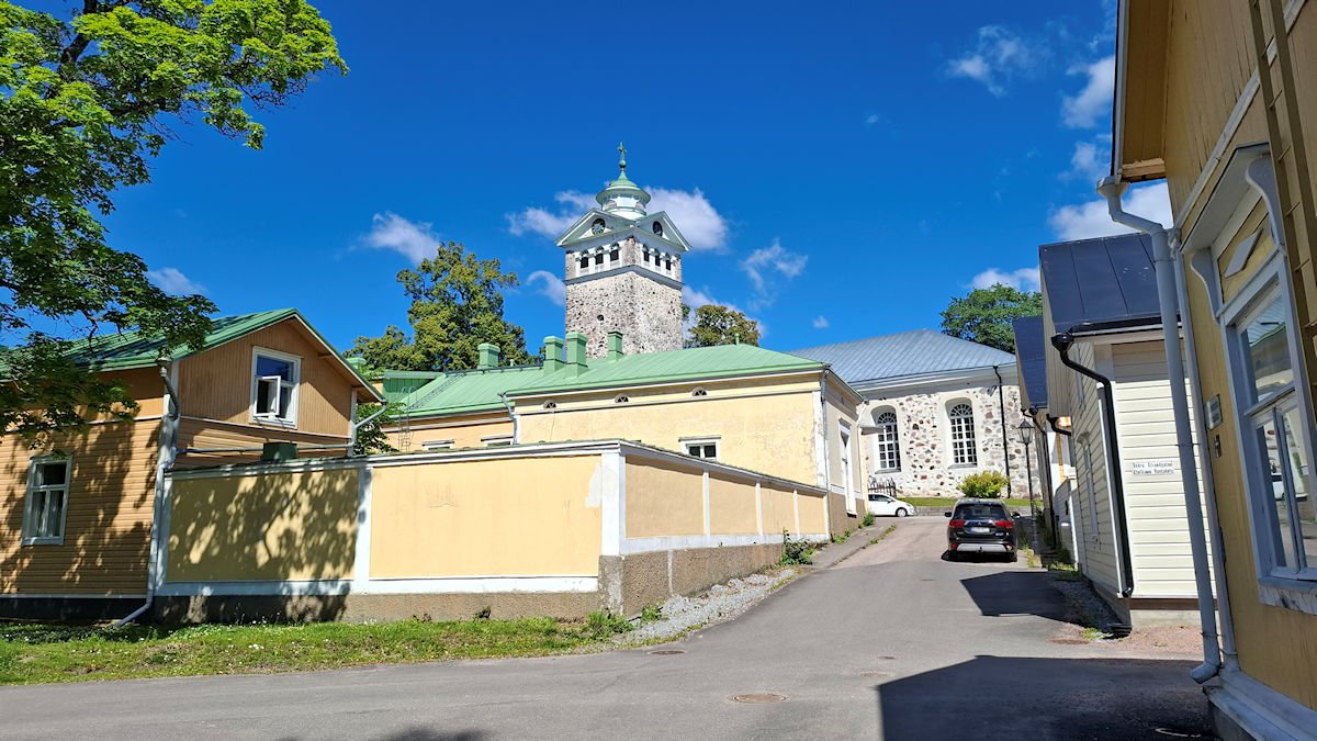 Museokorttelista jatkoimme kohti rantaa. Matka kulki kaivokatua pitkin Kipparipuistoon. Sieltä jatkoimme Tammisaaren Etelälahden satamaan. Kiersimme satamaa Satulasepänkadulle ja sitä pitkin kohti Tammisaaren kirkkoa. Matkalla oli vanhoja puutaloja. Keskusta vaikutti vanhalta osaltaan hiljaiselta. Raatihuoneen tori oli täynnä autoja, mutta ihmisiä oli liikkeellä todella vähän. Edes meitä turisteja ei ollut kuin nimeksi. Käsittääkseni Tammisaari on kuitenkin suosittu kesäkaupunki.