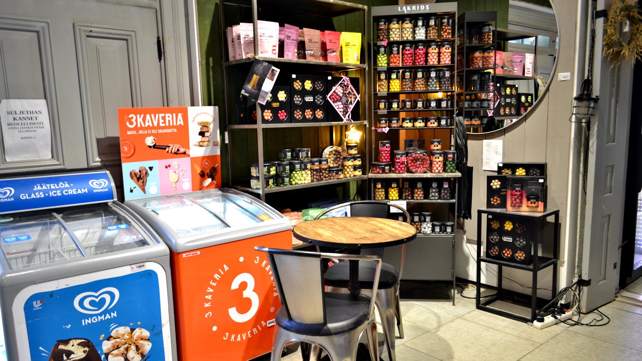 Kartanon liikkeessä saa myös kahvia. Muutama pöytäkin löytyy myymälän sisältä kahvin juontiin.