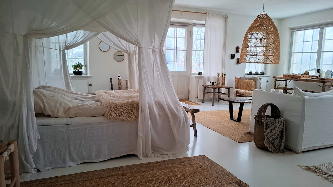 Noin 50m2 huone sisältää vuodekatoksellisen parivuoteen pellavapussilakanoineen. Ikkunoissa pimennnysverhot hyvän unen takaamiseksi. Tilavassa kylpyhuoneessa on kaksi suihkua sekä nautiskelijoille löytyy ruutuikkunan alla amme kylpyvaahdon kera.