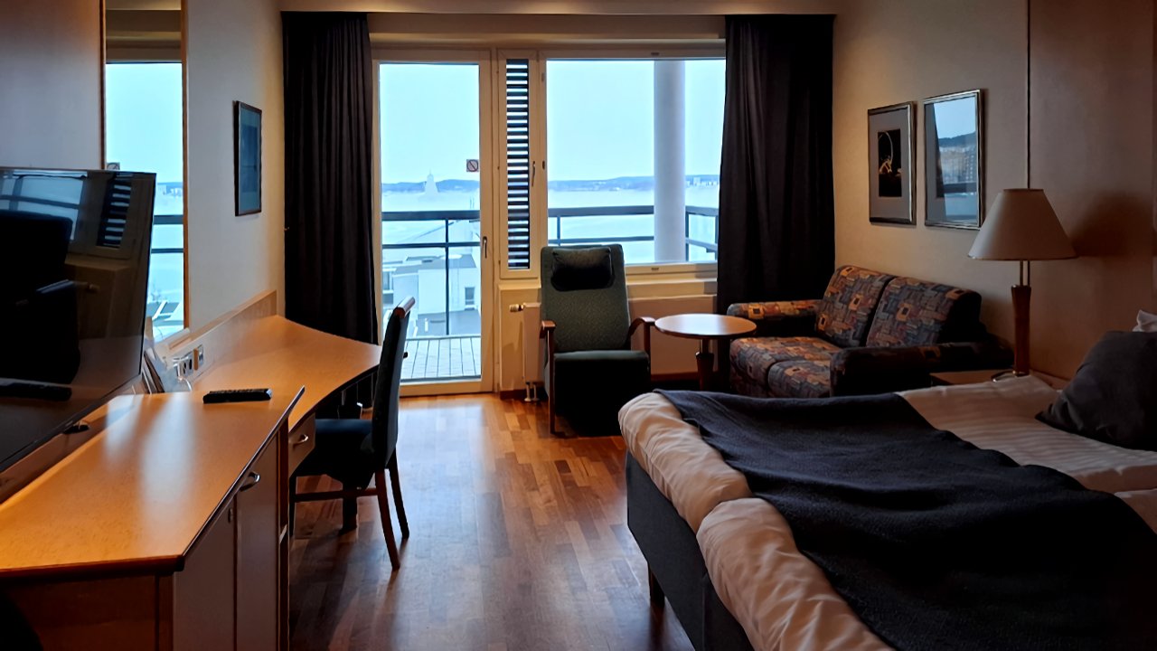 Huoneemme oli kyllä ylimmässä kerroksessa upealla näköalalla Näsinselälle ja Lentävänniemelle. Mutta jo ylimmän kerroksen käytävän matto oli aikansa elänyt. Pinttynyttä likaa ja matto oli irronnut pohjasta laineille. Onneksi emme kompuroineet käytävällä. Tilanne ei juuri parantunut huoneeseen mennessä. Lattia kiilteli tahmeista tahroista, sohvasta oli kangas repeytynyt ja kylpyhuoneessa oli tummia läikkiä sekä laatta- ja wc-pytyn jalan saumoissa että suihkukaapin alareunassa. Lisäksi wc-harja puuttui. Matkalla tuli myös peruutus seuraavan päivän jalkahoidosta. Tarjottiin seuraavaa aikaa tasan viikon päähän seuraavaan keskiviikkoon.