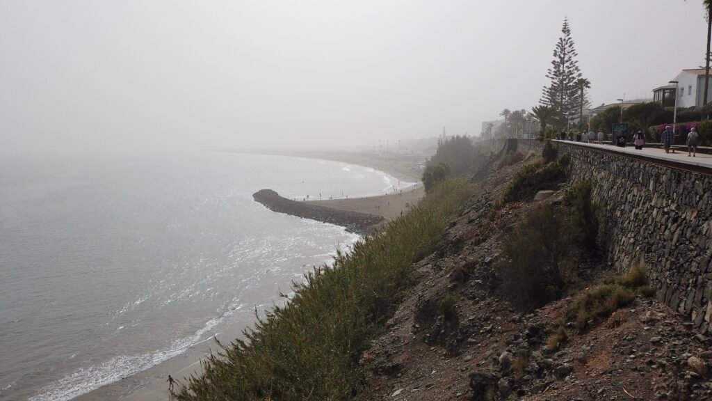 Kanarian saarilla on viikonlopun aikana vaikuttanut La Calima. Calima syntyy kun ilmavirta kääntyy kuljettamaan lämmintä ilmaa Saharan suunnalta. Sen mukana tuleva hiekkapöly on heikentää näkyvyyttä ja hengitysilmaa. Eilen oli, virallisen ilmoituksen mukaan, ollut Gran Kanarialla näkyvyys minimissään 1300 metriä. Varsinaisesta hiekkamyrskystä ei voi puhua, mutta hiekkaa on kohtuullisesti ilmassa. Sitä lämmintä ilmaa odottelen. Viime yönä oli huimat 14 astetta ja päivälläkin virallisesti vain 20. Tosin rannan tolpat väittivät lämmön olevan 25 astetta.