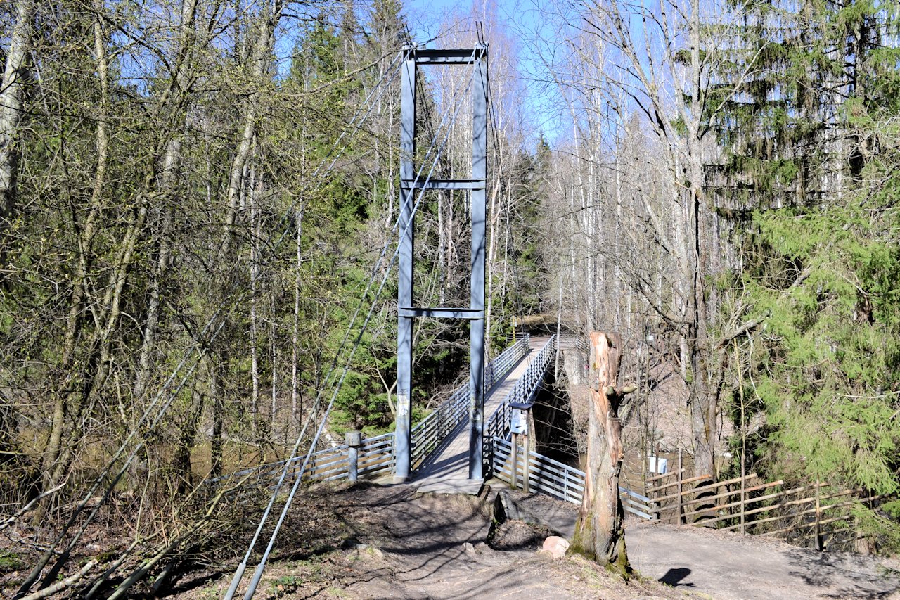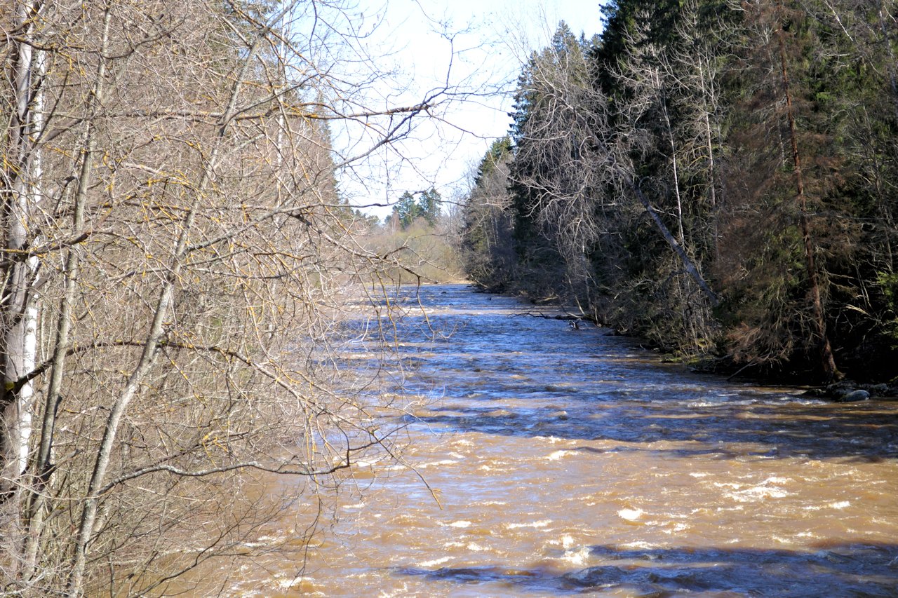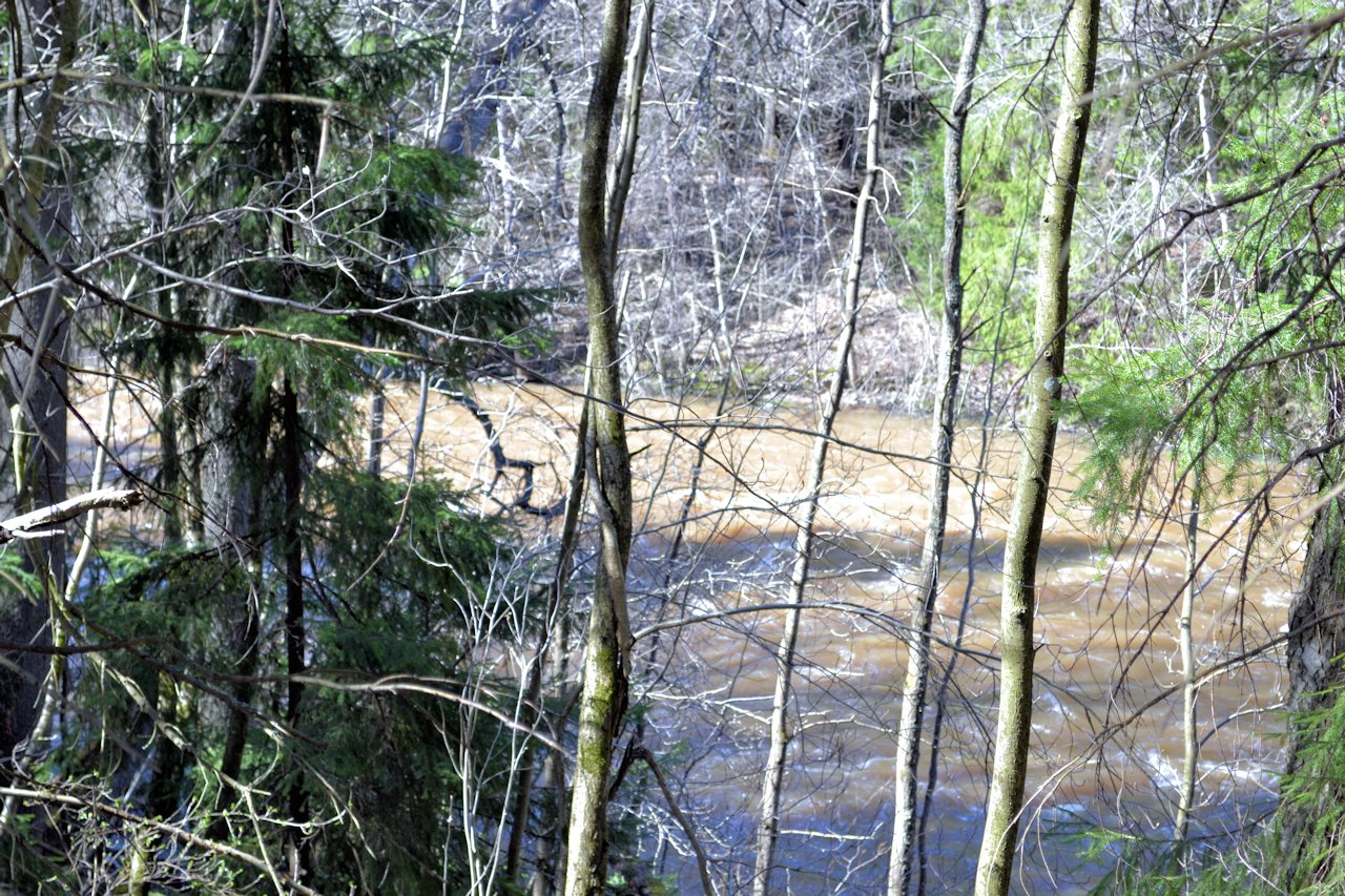 Olin käynyt koskella aprillipäivänä, kun metsässä oli vielä lunta. Sulavedet olivat täyttäneet kosken. Tulva ei ollut kuitenkaan noussut uomasta poluille asti. Sillä kertaa en poikennut vielä luontopoluille, koska polkujen pohjat olivat joko jäässä tai mutavelliä.