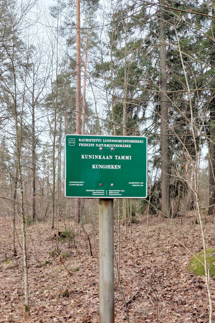 Kävelyreitin varrella Kuninkaantammesta Pitkäkosken majalle on tielle ja koko alueelle nimensä antanut tammi. Vuonna 1956 rauhoitettu puu sijaitsee Kuninkaantammenpuistossa. Tarina kertoo, että puun istutti itse Ruotsin kuningas Kustaa III 1700-luvun lopulla. En saanut selvitettyä miksi hän sen istutti. Toisen tarinan mukaan puu oli vasta näre kun kuninkaalle tuli hätä kesken matkan Turusta Porvooseen. Hän kävi puun juurella helpottamassa oloaan. Siitä sai puu kasteen Kuninkaan tammeksi.