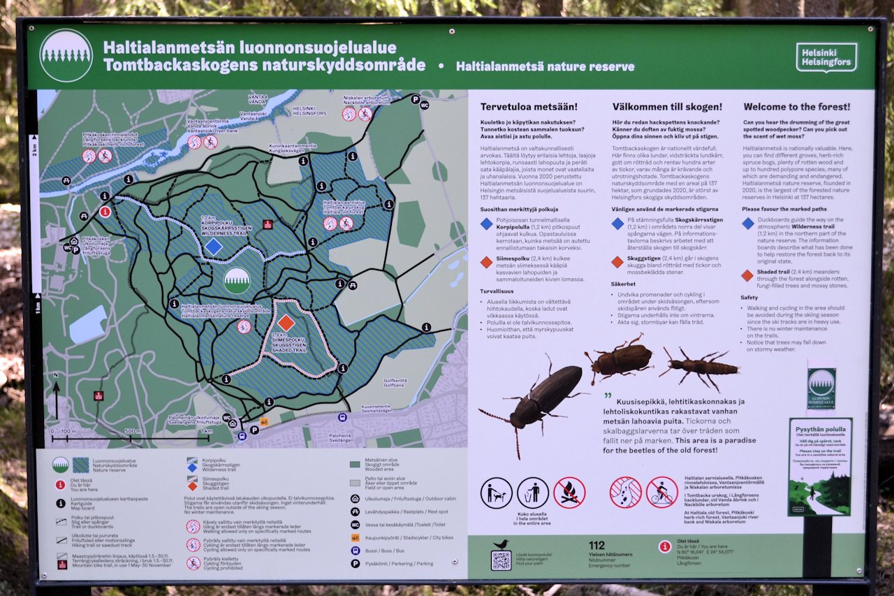 Nousin luontopolulta loivaa mäkeä Kuninkaantammentielle. Keskuspuiston alueella on tien varressa erikseen muun muassa Haltialanmetsän 137 hehtaarin luonnonsuojelualue. Sitä koskee samat rajoitukset kuin Vantaanjoen rantaa, joskin joillakin alueilla pyöräily on sallittu. Sallitut reitit on merkitty merkein. Palaan myöhemmin Haltialanmetsän samoiluun. Helsingin keskuspuistossa on vielä paljon nähtävää ja koettavaa!