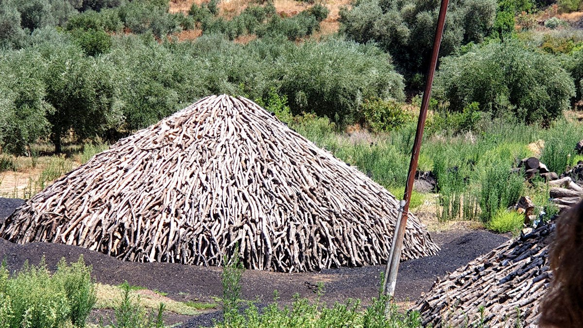 Seuraavaksi reitti kulki Xamoudchorin kylän läpi. Täällä ei pysähdytty. Kapeat kujat, kivitalot ja rauhallinen tunnelma tarjoavat vilauksen aitoon kreetalaiseen maalaiselämään. Matkalla sinne oli mukavia näkymiä ja muutama kytevä keko. Niissä valmistui grillihiiliä. Kreeta on iso grillihiilien vientimaa. Näin ainakin käsitin oppaan kertomasta.
