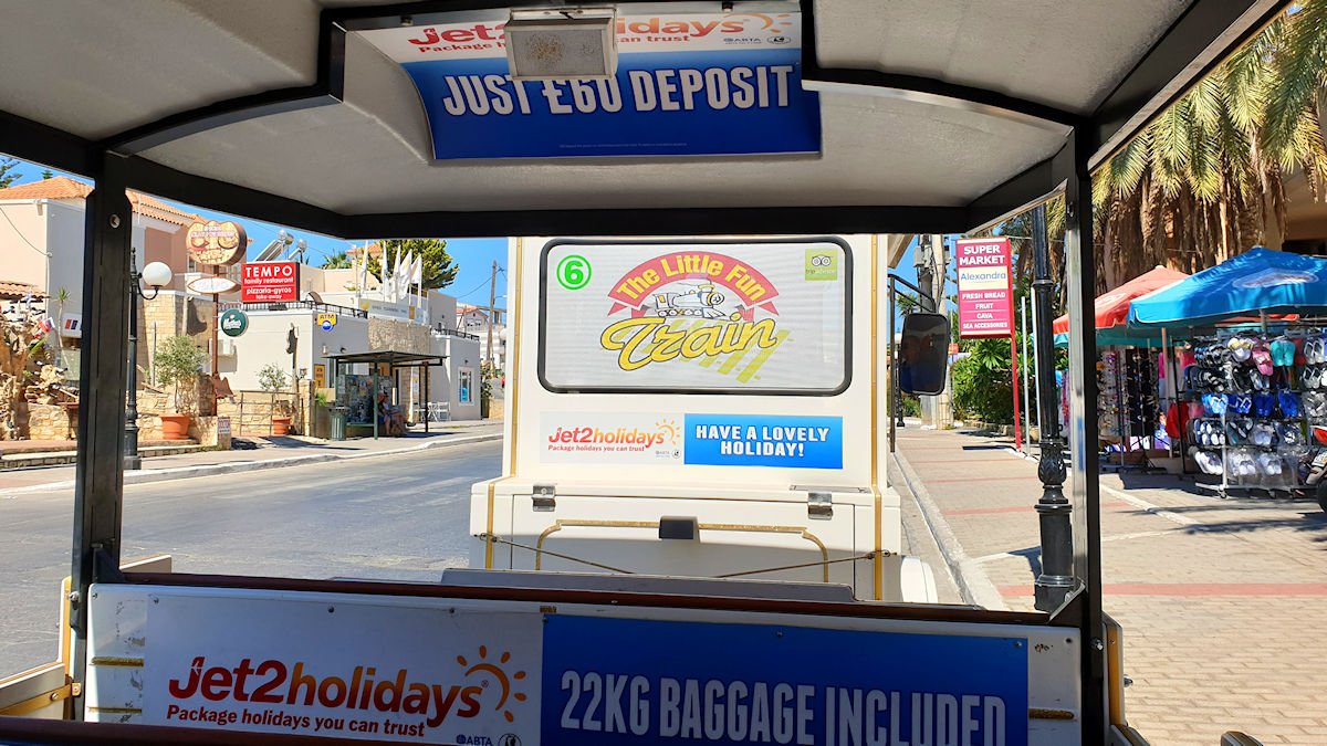 Nousin junaan hotelli Alexandran kohdalta Agia Marinassa. Aiemmilta pysäkeiltä ei ollut juurikaan tullut matkalaisia mukaan, joten pääsin eturiviin. Muita matkalaisia ei päätyisi kuviin, mutta toisaalta veturin takaseinä oli suoraan edessä. Matkalla poimimme lisää matkustajia Plataniaksesta, Geranista ja Malemesta. Lopulta junamme alkoikin olla jo täynnä. Matkalla oli mukana lippujen tarkastaja, joka toimi myös oppaana. Opastus oli englanniksi ja saksaksi.