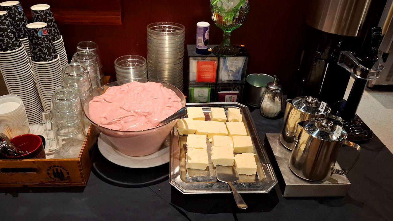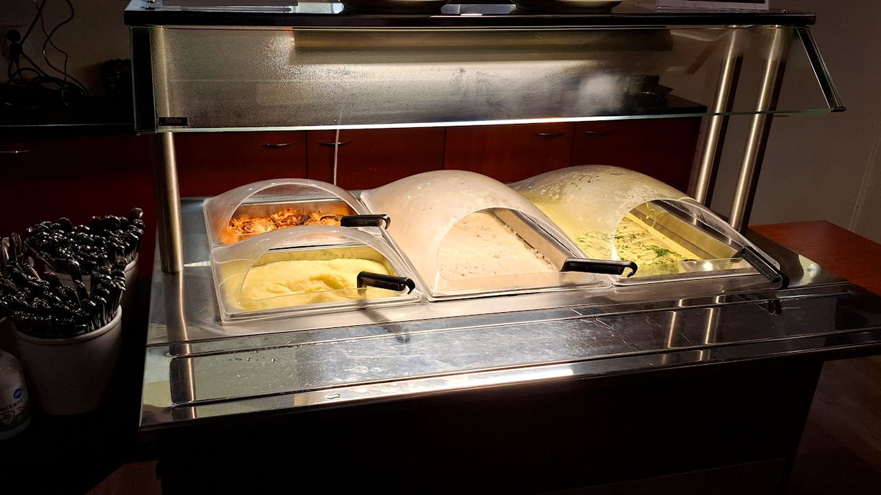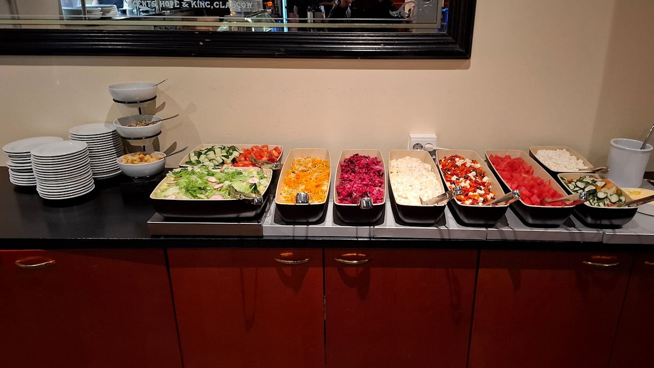 Käydessämme oli lounasmenussa tarjolla keitto, lisukkeena runsas salaatti, pääruokina lihaseljankaa, smetanapossua, kalamureketta sekä keitinperunaa & kasviksia. Lisäksi lisukkeena perunamuusia. Lounaaseen kuuluvana jälkiruokana oli luonnollisesti kahvi. Lisäksi vispipuuroa ja pannacottaa.