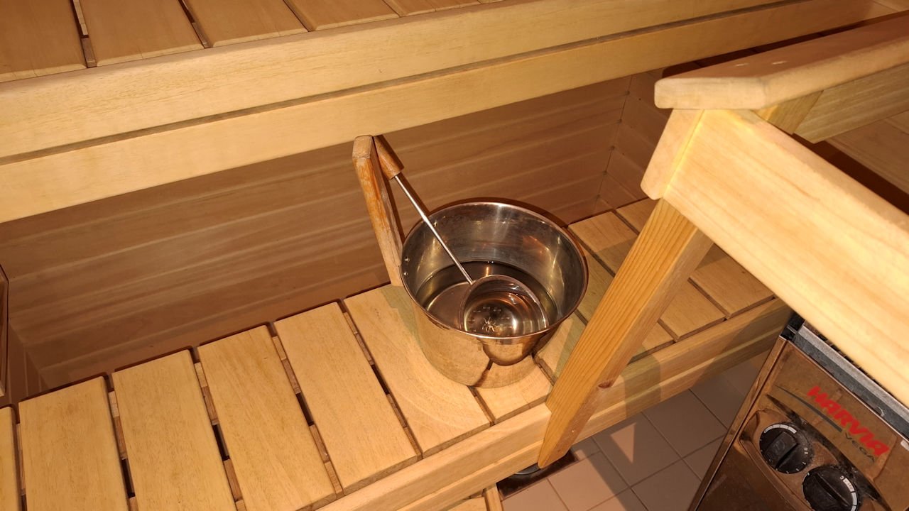 Myöhemmin illalla oli vuorossa huoneiston saunan koekäyttö. Lämpeneminen kesti todella pitkään. Liekö yksi vastus palanut tai muuten vastukset väsyneet. Sauna oli pieni. Yksi henkilö kerrallaan mahtui saunaan ja silloinkin piti olla lauteiden suuntaan. Laude oli todella kapea. Lisäksi kiuas oli kooltaan “vakiokokoinen” eli kivipesä tuli puisen yläkaiteen alle. Jalkoja ei kuitenkaan pystynyt pitämään yläkaiteella, vaikka se olikin asennettu kallelleen lepuutusta varten. Olisi tullut varpaista saunamakkaroita. Löylyt sai kuitenkin otettua ja pääsi puhtaana lakanoihin.