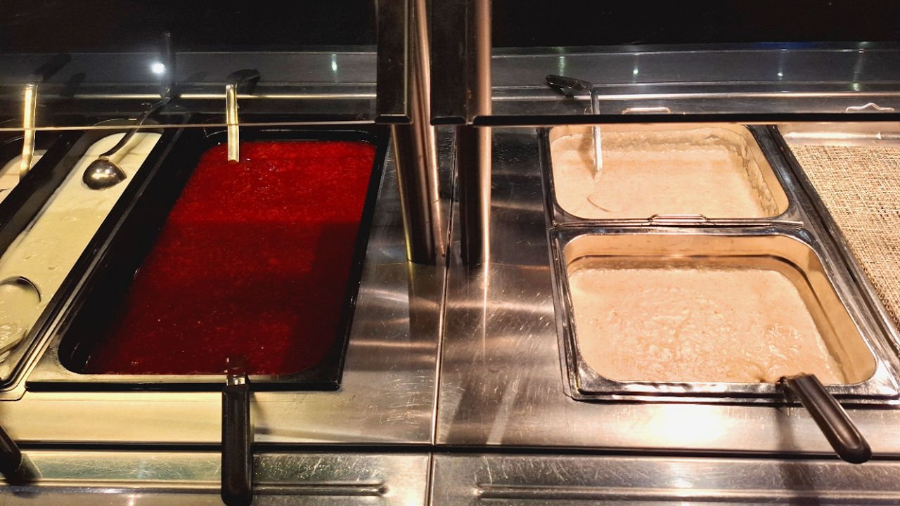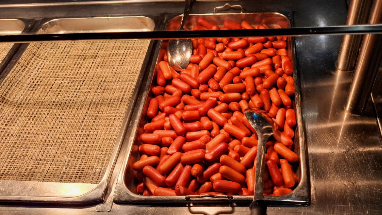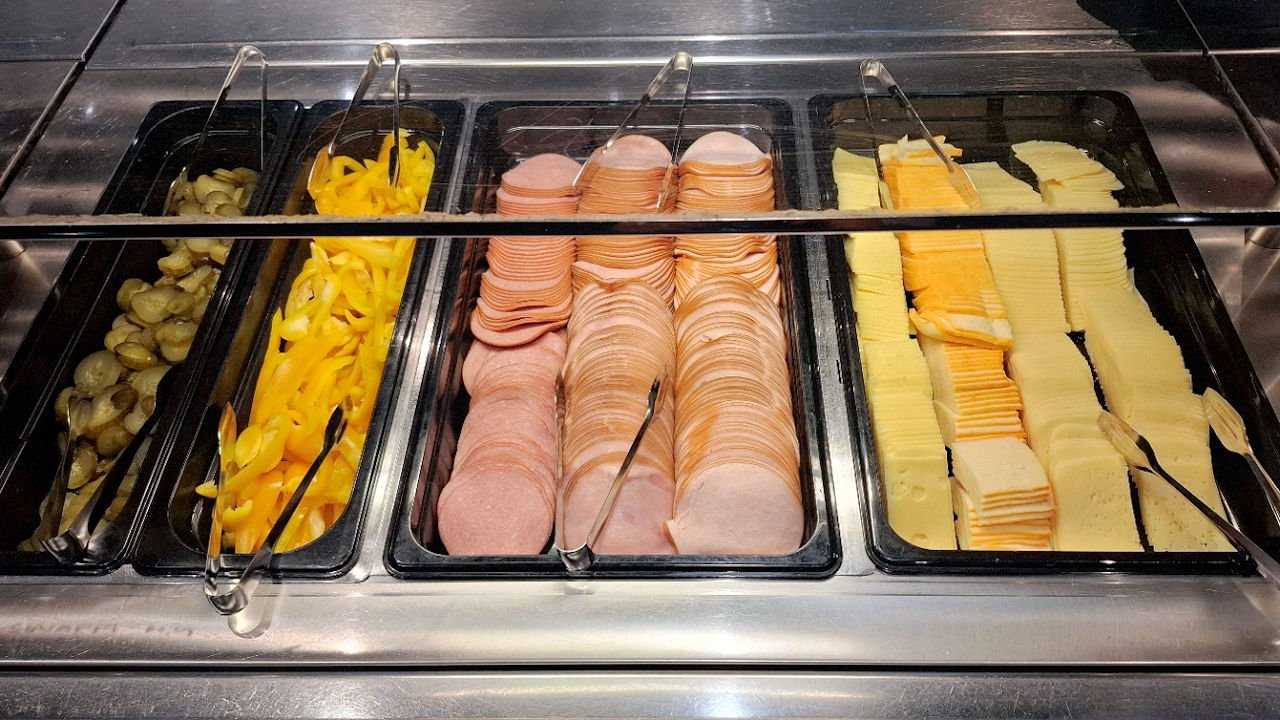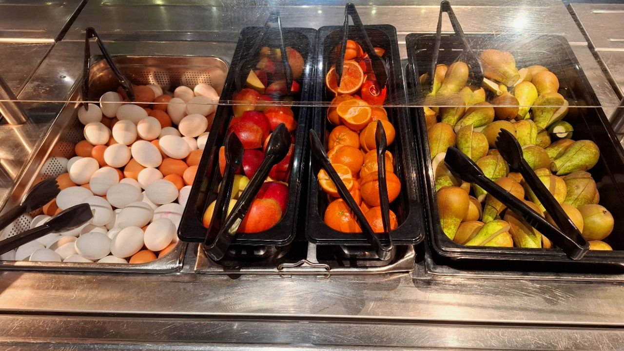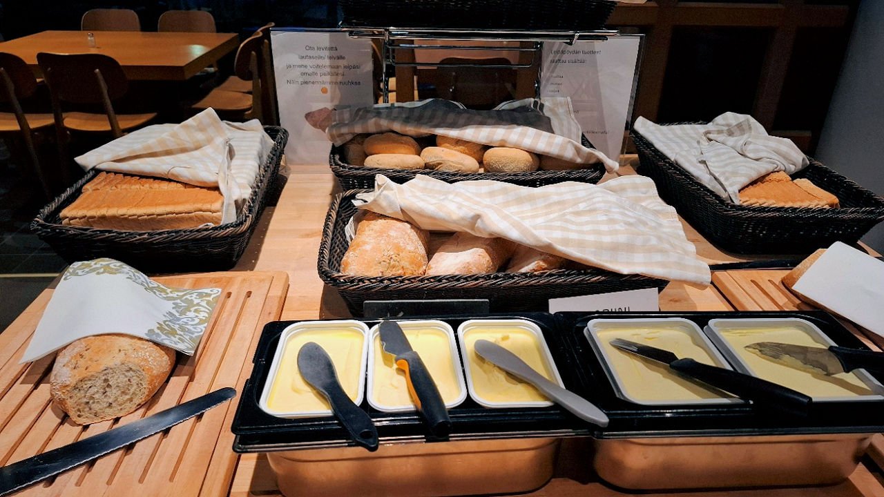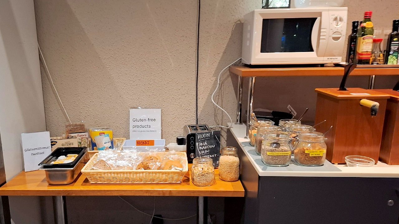 Liikuntahotellin aamupala on tarjolla seisovassa pöydässä kello 7-10 joka päivä Eppula Buffetissa. Täällä syövät myös muissa tiloissa asuvat leiriläiset ja vieraat. Tarjolla on perus aamiasbuffet. Itse jäin kaipaamaan munakasta ja pekonia. Tarjolla oli toki keitettyjä munia ja prinssinakkeja. Maanantaina tosin nakit olivat vaihtuneet lihapyöryköiksi. Leivänpaahtimia oli neljä joista kolme normi käyttöön ja yksi pelkästään gluteenittoman leivän lämmittämiseen.