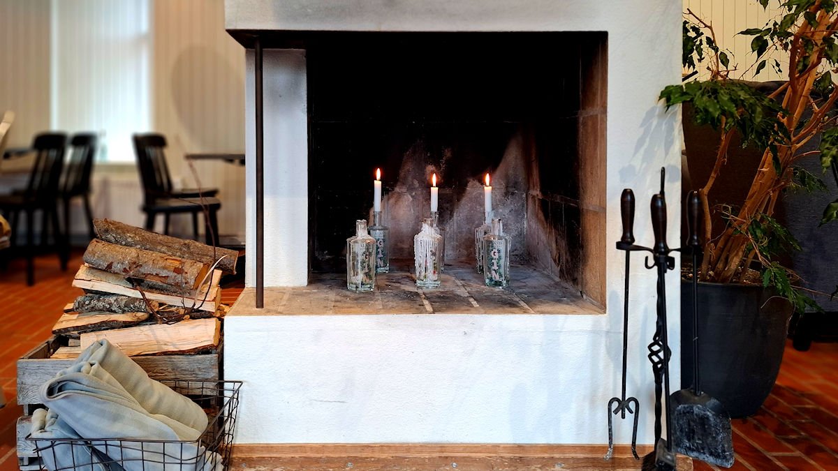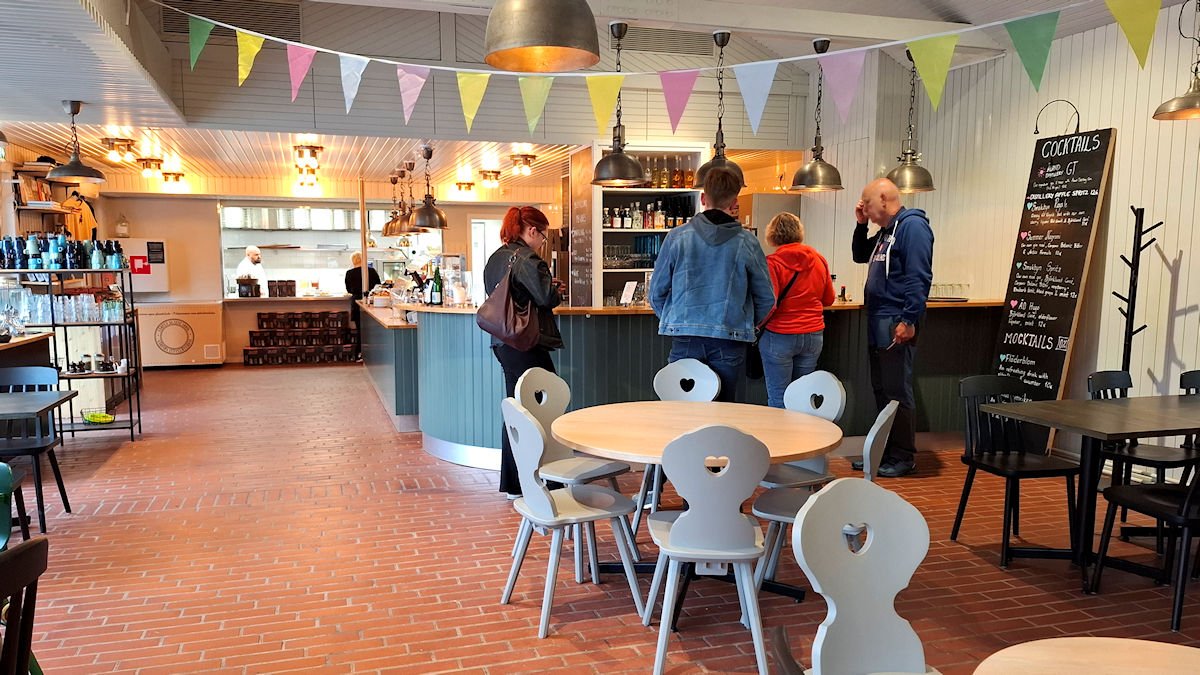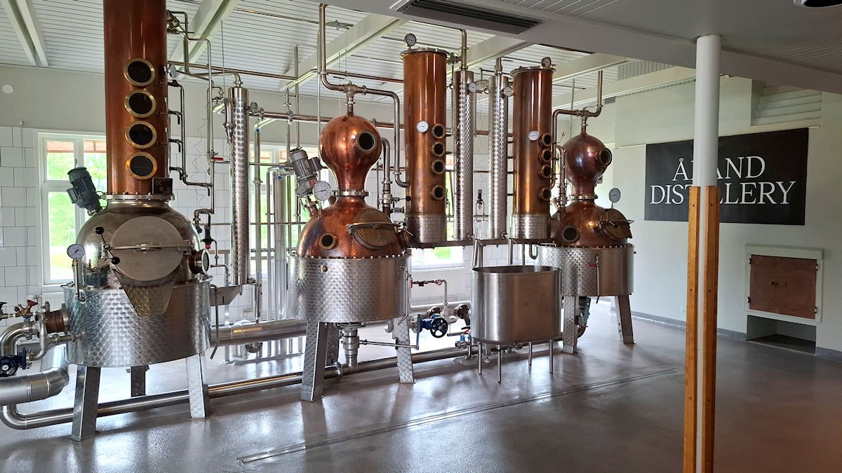 Linnassa ja Vita Björnissä ei ole palveluita, mutta lähellä oleva Åland Distillery tarjoaa kahvia ja pizzaa. Toki myös omien tuotteittensa juomamaistiaisia. Mehän suunnistimme tietenkin tislaamoon kahvitauolle. Hyvin maistui kahvin kannsa myös Ahvenanmaan pannukakku. Kahvio on auki kyltin mukaan joka päivä kello 10-17.