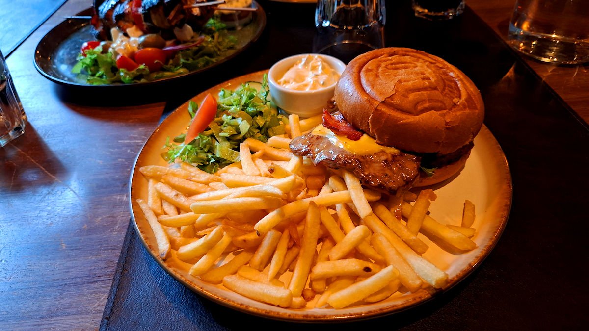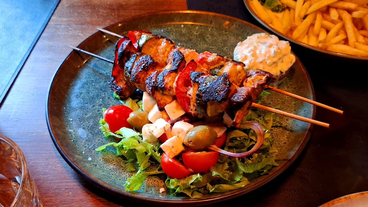Kävimme syömässä keskustan DINOS’S BAR & GRILLissä. Alkupalaksi otimme valkosipulileivät. Hampurilainen oli erinomainen ja kreikkalainen salaatti kanavartaalla oli kuulemma erityisen maukas. Siinä oli mukana kaksi kanavarrasta, joten riittää hyvin lounaaksi. Hinnoista sen verran, että valkosipulileivät maksoivat 10€, pekoni-juusto burgeri 21 €, kreikkalainen salaatti kanavartaalla 21 € ja isot limut 4,20 €.
