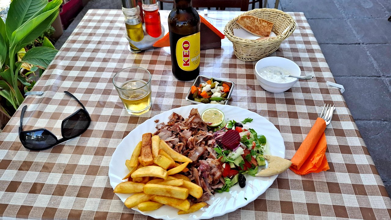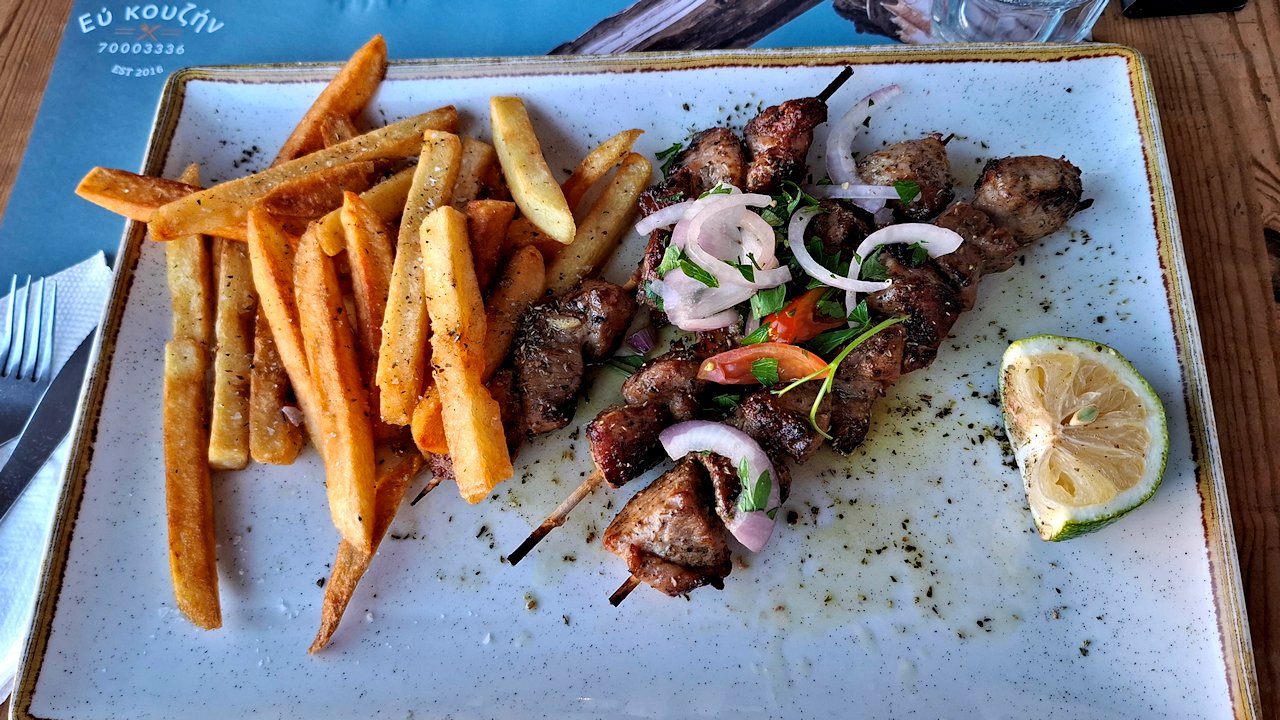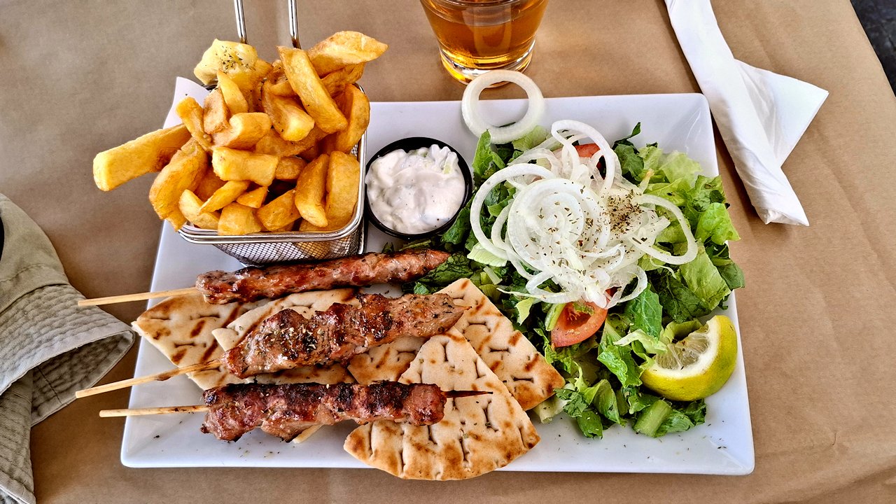 Vanhassa kaupungissa on take away ravintola Souvlaki Gr. Ainakin paikan nimikkotuote, suvlaki oli hyvää ja maksoi vain 8,20€ ja 0,5l Leon olut 3,30€. Annos oli riittävä ja nätisti laitettu lautaselle. Salaattikin vastasi lähes suosituksia. Ei ihme, että paikalliset jonottivat ravintolaan sisälle. Iso suositus vaikka voikin joutua hetken odottamaan.