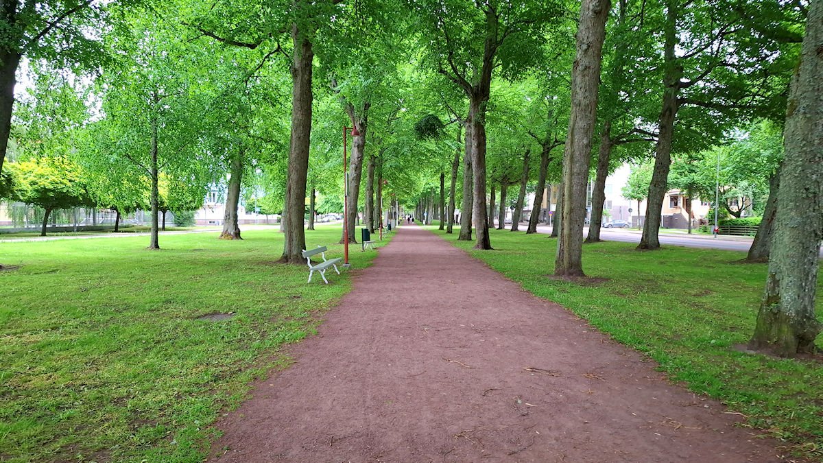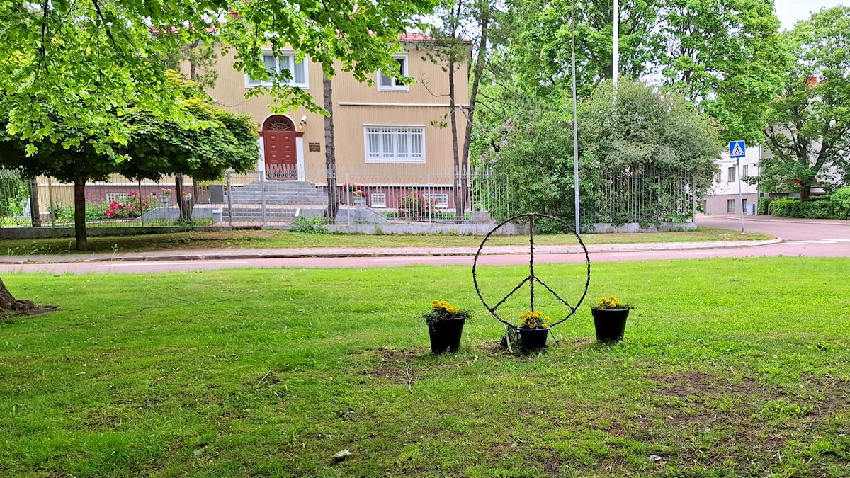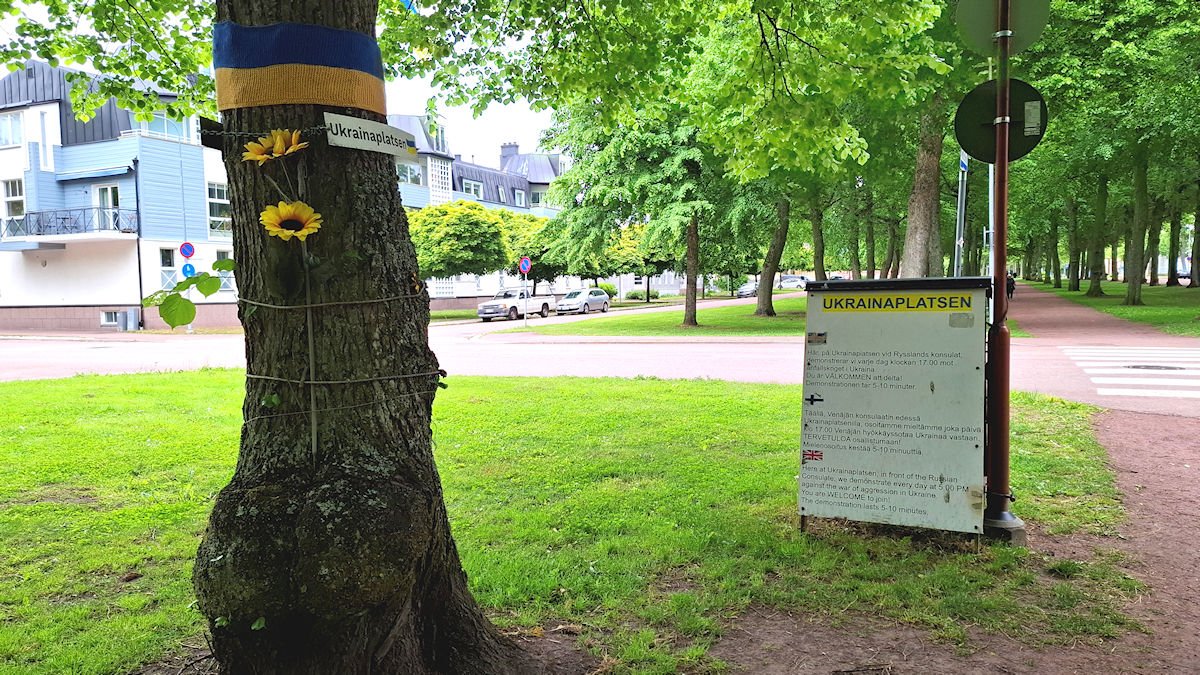 Jätimme auton parkkiin Norra Esplanadgatanin ja Stora Gatanin välissä olevalle parkkipaikalle lähelle Ahvenanmaan merenkulkumuseota. Sieltä suuntasimme pitkin Esplanadenin puistoa kohti Pyhän Yrjön kirkkoa. Matkalla oli Venäjän konsulaattia vastapäätä Ukrainaplatsen. Se erottui vain väliaikaisesta kyltistä, kukkaisista ja peace-merkistä.