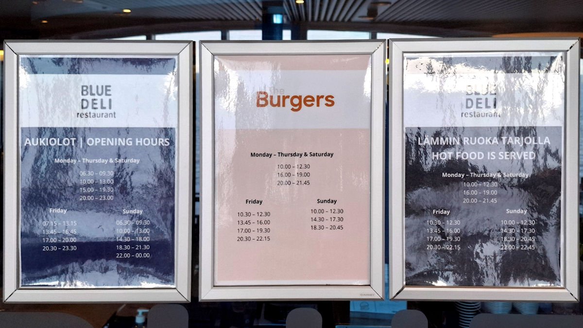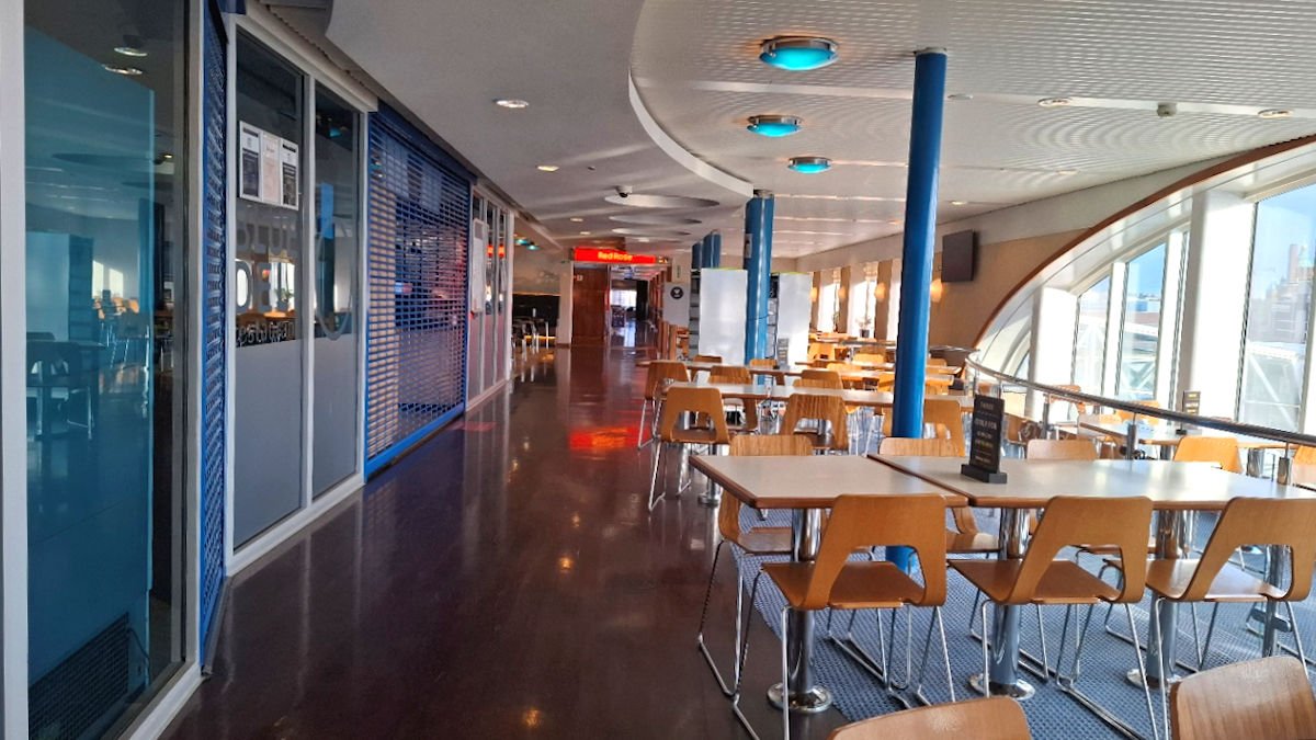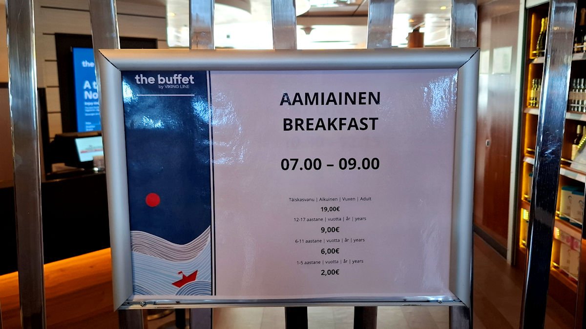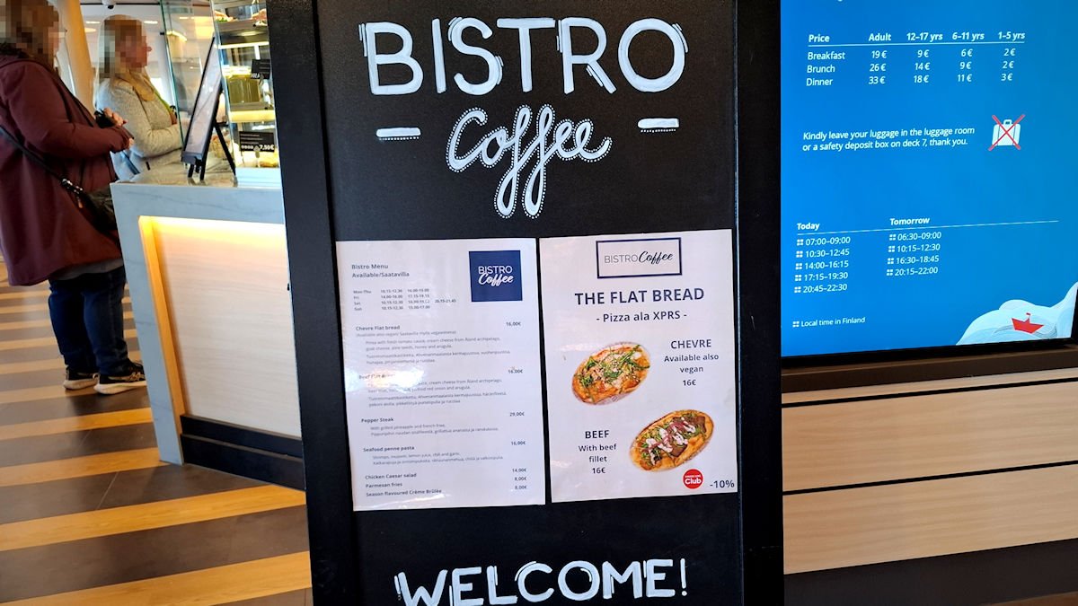 Aloimme etsiä aamupalapaikkaa. Blue Deli ravintolan piti avautua tasan kello 7 aplikaation mukaan, mutta seinässä olevan taulun mukaan vasta kello 7.15? Meidän onneksi aplikaation aika piti paikkansa ja pääsimme aamupalalle. Buffet ja Bistro Coffee myös avautuivat kello 7. Aamiainen Buffetissa olisi maksanut 19 €! Tyydyin kuitenkin Blue Delin kinkkujuusto sämpylään ja kahviin. Santsikuppi maksoi 50 senttiä.