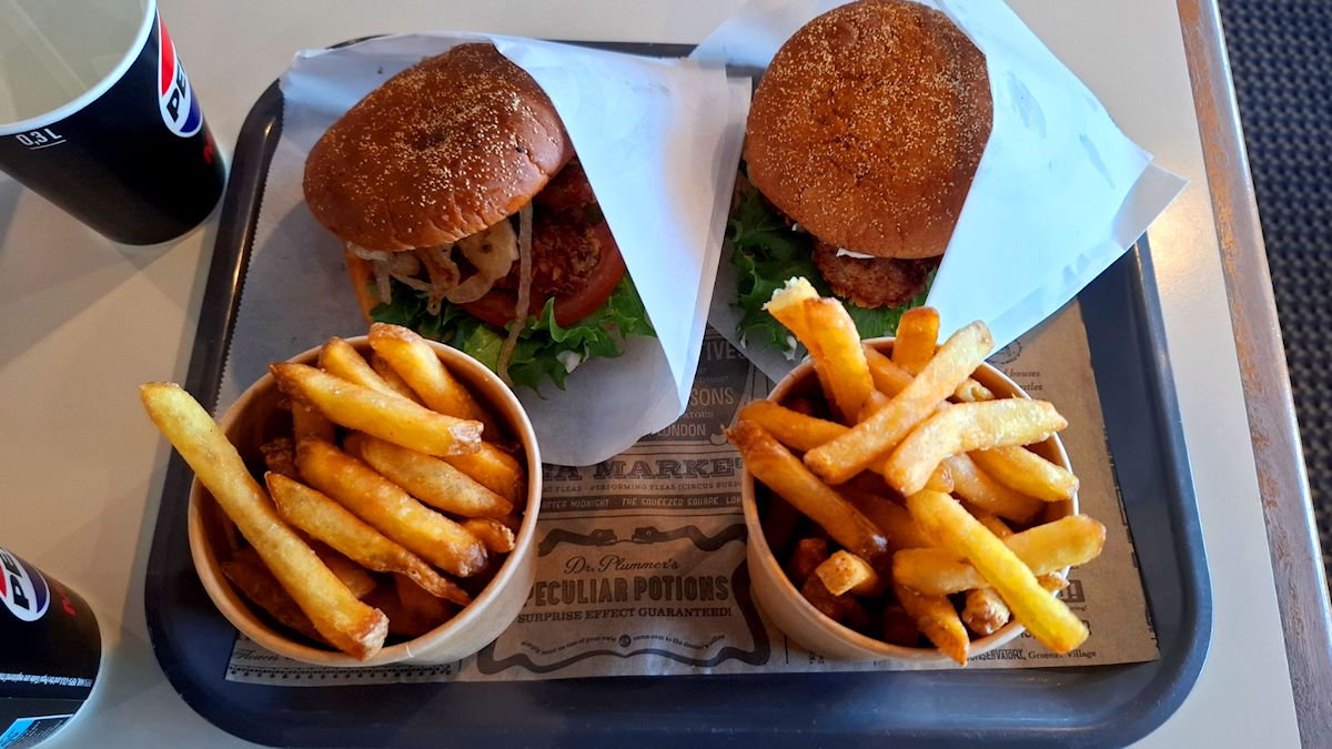 Päätimme, että tällä kertaa emme syö Blue Delin ”kotiruokaa” vaan tilasimme suoraan kassalta Chicken Burger Mealsit keskikokoisilla ranskalaisilla ja 30 cl virvoitusjuomalla. Annoksen hinta oli 14,50 €. Ratkaisu oli väärä. Kana oli niin sitkeää ettei purukalusto siihen kunnolla pystynyt. Annos oli kohtuu hyvännäköinen, mutta maku ja suutuntuma eivät vastanneet hintaa. Käymme nuorison kanssa melko usein eri hampurilaisravintoloissa Suomessa ja muualla. Tällä hintatasolla olisin odottanut laadukkaampaa annosta.