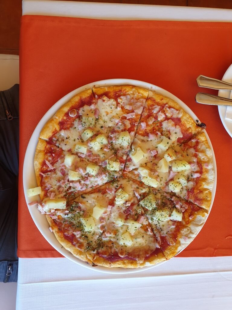 Hotellilla oli ravintola jo avattu, joten poikkesin syömään yhden peri kanarialaisen ruuan eli kinkkuananas pizzan.