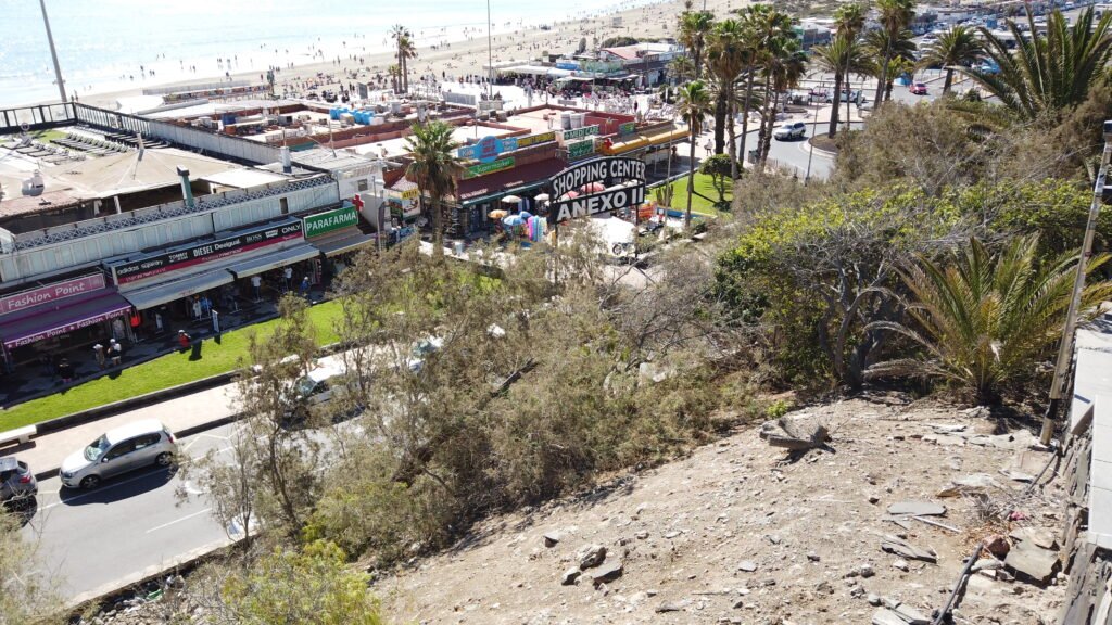 Saavuin rannalle Apartamentos Los Angelesin ja Aparatamentos Miramarin välistä. Täällä on tehty aallonmurtajilla tekohiekkarannat Bahia del Inglesin alueella.