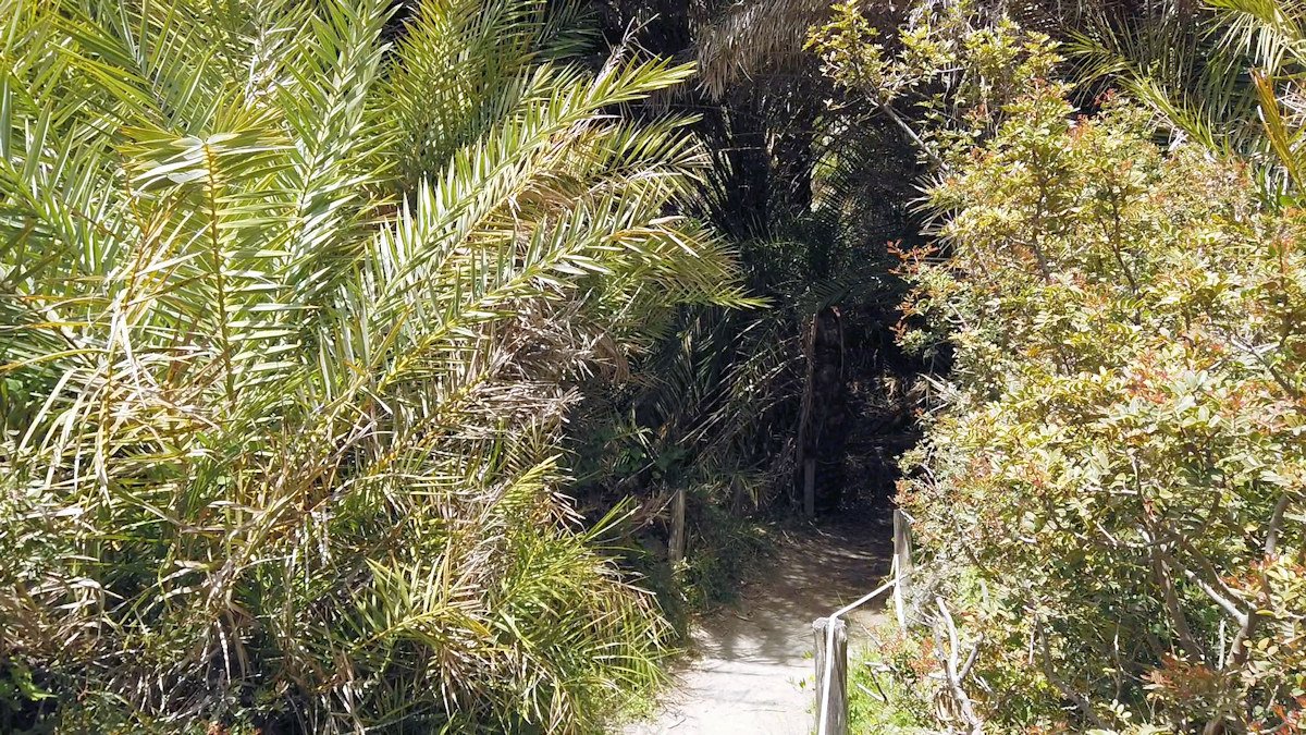 Palmumetsän portille oli laitettu kietotaulu ettei metsään saisi mennä metsäpalovaaran vuoksi. Oletin, että ne oli laitettu loppukesän tarpeeseen. Täällähän oli muutama päivä sitten pari sadepäivää ja vuorilta sulaa vielä lumi. Palmumetsä paloi vuonna 2010, mutta kasvillisuus on elpynyt hyvin. Metsään oli hyvä ohjaus. Suunnasta ei voinut erehtyä. Menin siis metsään. On se aika taianomainen jokineen.