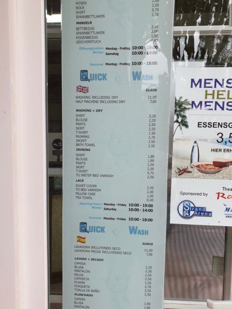Eilen tuli sitten se hetki eteen, että alusvaatteita ei riitä kuin maanantaiksi eli tänään, maanantaina, on pyykkipäivä. Vein kassillisen vaatteita pesuun tasan kello 10 kun myymälä avattiin. Olin jonon ensimmäinen. Toki pesulan ovi oli jo auki saapuessani, mutta saksalainen omistaja käski pysymään ulkona koska kello oli 9:58. Saksalaista täsmällisyyttä.