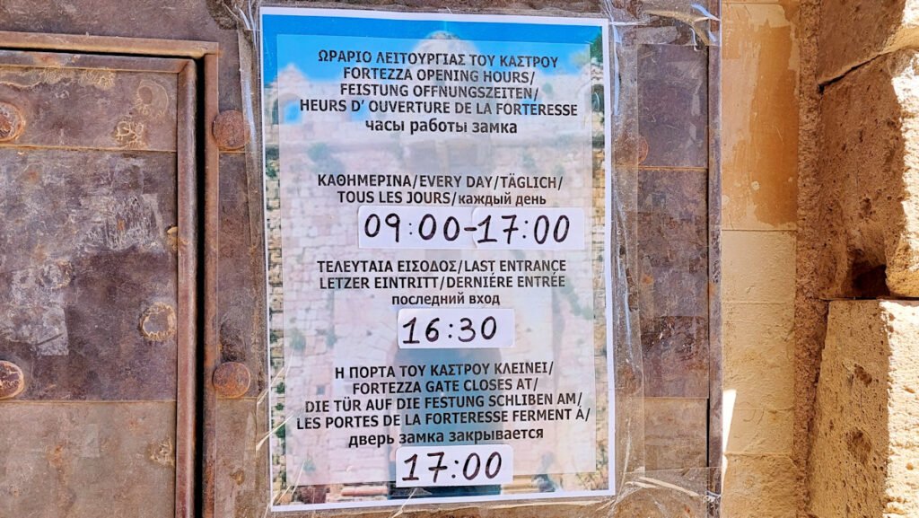 Kentällä oli juuri menossa jokin tärkeä ottelu päätellen katsojien määrästä ja innokkaasta elämöinnistä. Kunnantalon takaa menee katu, Ioannou Melissinou, jonka varrella on kaksi pysäköintipaikkaa. Niistä on lyhyt matka nousta linnoitukselle. Minä valitsin siis rannanpuolelta kierron. Ihan näköalojen vuoksi.