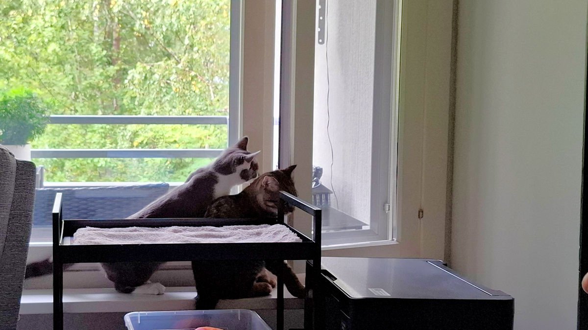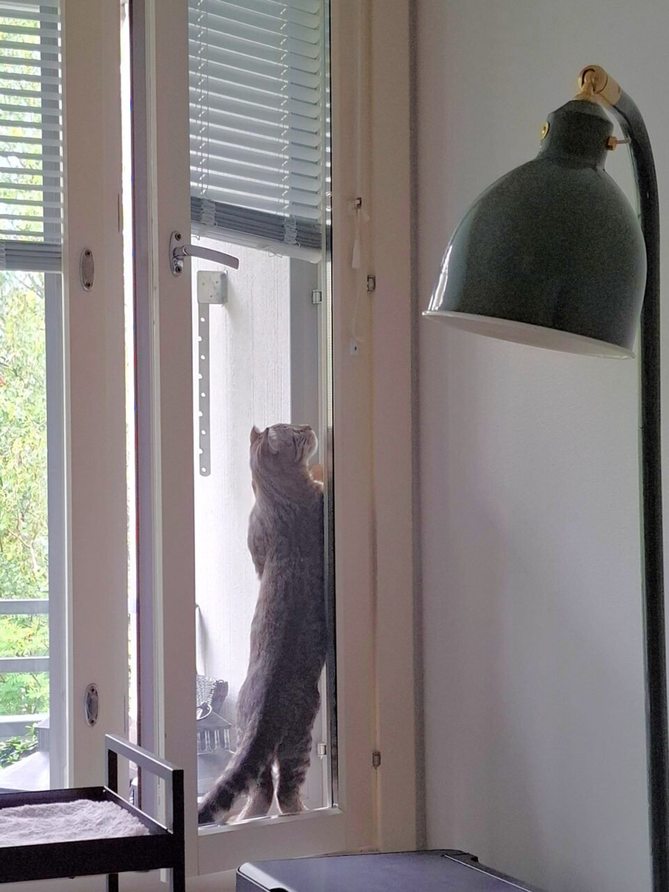 Kun päätös kissoista oli tehty, etsimme ja haimme kissoille sopivia tavaroita ympäri Etelä-Suomea. Parvekehäkinkin kasasimme, mutta se vaikutti lopuksi sen verran huteralta, ettemme ottaneet sitä kissojen käyttöön. “Pennut” olivatkin kookkaampia kuin olimme kuvitelleet.