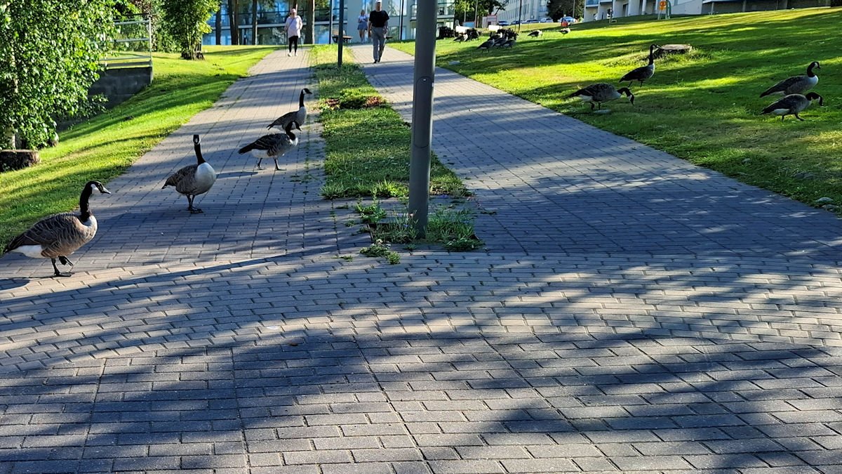 Päivällisen jälkeen lähdimme pienelle kävelylle rantaan. Uimareita hyppi vielä illan suussa venelaiturilta veteen. Hiekkarannalla oli jokunen valkoposkihanhi estämässä sieltä uimaan lähteviä. Suurin osa linnuista oli kuitenkin jo siirtynyt ruohikolle syömään.