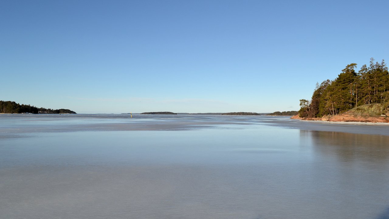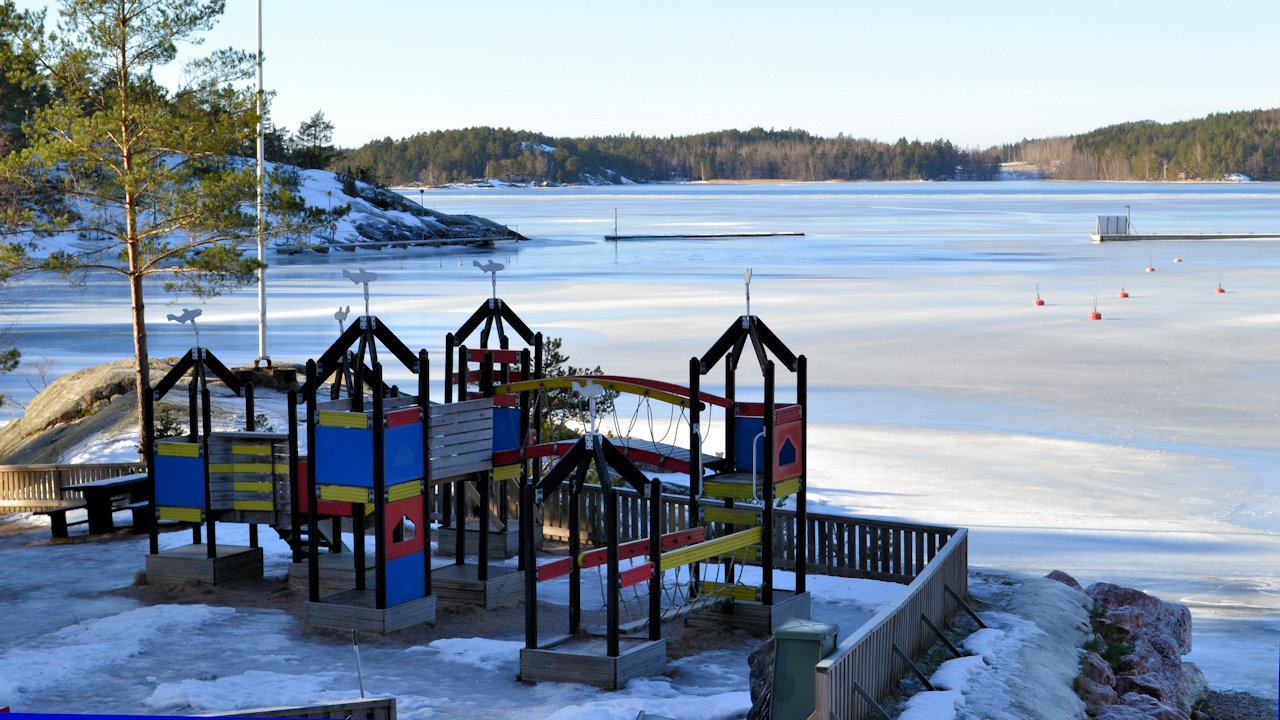 Auringon hieman noustessa lähdin laiturille kuvaamaan rannikkoa. Saaristo on kyllä kaunis näin talvellakin. Ja autio. Ihmisiä ei juurikaan näy. Lasten äänet kyllä kuuluivat lahdelle joten aivan yksin en ollut liikkeellä. Toivottavasti kuva kertoo seesteisesta säästä. Näillä jääillä olisi onnistunut retkiluistelukin.