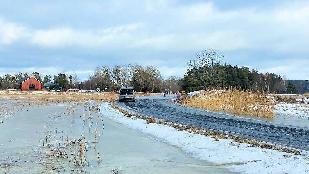 Kauppa- ja ruokareissu olikin kohtuullisen jännittävä. Perjantain sateet olivat sulattaneet rutkasti lunta ja Airiston tiellä oli parikymmentä senttiä vettä. Se oli suljettu. Tasan yksi kinttupolku, jolla pystyi tulvan kiertämään. Juuri ja juuri auto kerrallaan mahtuu tielle. Sen pinta oli peilijäässä. Paitsi yhdessä kohtaa, jossa tiepohja oli pehmennyt ja rengasura niin syvä että pelkäsin auton jäävän pohjastaan kiinni. Ei auttanut muu kuin mennä vauhdilla yli ja toivoa, ettei mitään ikävämpää vikaa tule autoon ja pysytään tiellä. Kaupasta täydennykset muutamaksi päiväksi (jos tie ei aukea) ja pizzeriasta ne Leo’silta tilaamatta jääneet pizzat.