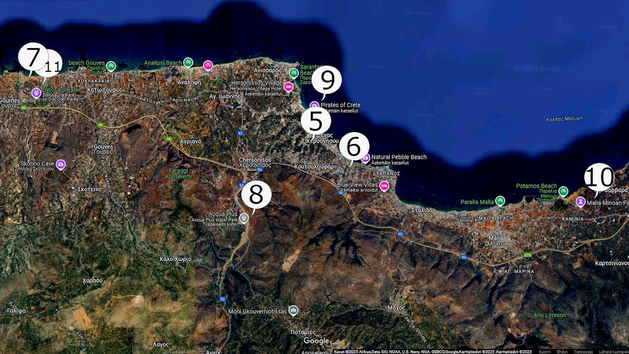 Gouvesissa on myös Dinosaur Park (11). Itse en ole siellä käynyt, joten sen soveltuvuutta lapsiperheiden viihteeksi en pysty arvioimaan. Se saattaa olla aivan kunnollinen, koska kuuluu samaan konserniin kuin Watercity hieman Gourmnesista Iraklioon päin. Dinosaur Park on kuitenkin Cretaquariumin lähellä. Jos tulee ns. Vanhaa tietä Hersonissoksesta, niin ajaa sen ohi matkalla kohti akvaariota. Dinosaur Parkin vieressä on myös Planetaario. Aiemmin mainitsemassani Watercityssä olemme käyneet vuosia sitten. Silloin sekin oli ihan käymisen arvoinen paikka. Nykytilasta en osaa sanoa.
