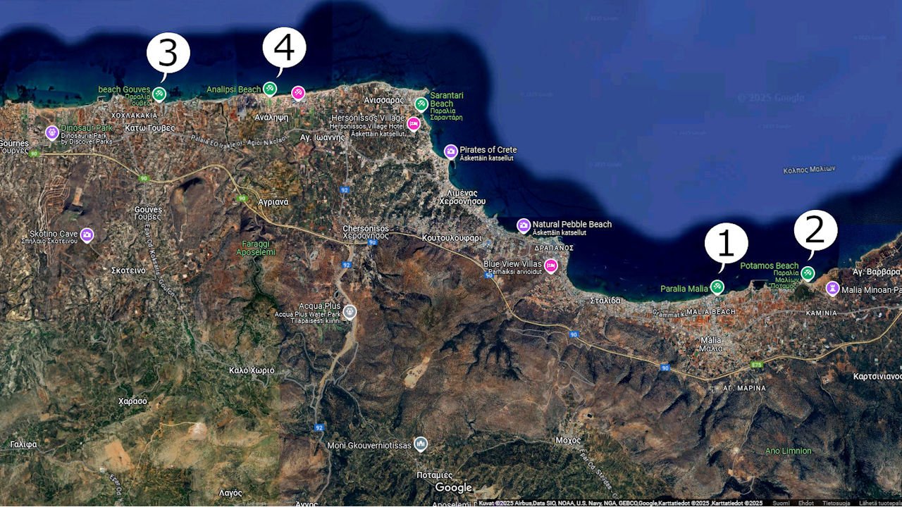 Hersonissoksessa ja sen lähistöllä on monta hyvää uimarantaa. Jos on vuokrannut auton tai taksi ei pelota, niin suosittelen Malian (1) ja Potamoksen (2) rantoja. Itse asiassa Malian uimaranta jatkuu Potamoksena itään päin mentäessä. Todella upea ranta, jossa ei ole ruuhkaa. Lapsille on hiekkaa tarjolla riittävästi. Potamoksen parkkipaikka on länsipäässä oleva hiekkakenttä, josta on muutama sata metriä Malian palatsin arkeologiselle kohteelle. Autolla kannattaa seurata viitoitusta kohti palatsia ja ajaa ohi Palatsin pysäköintialueen. Suunta siis Malian keskustaan.