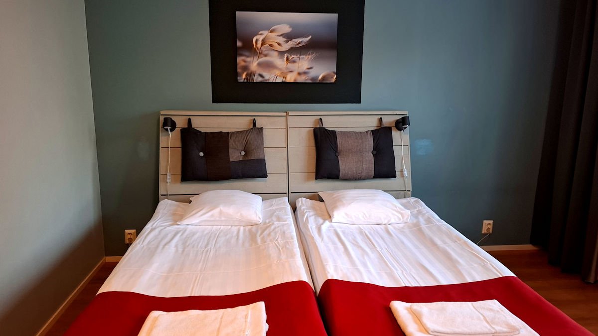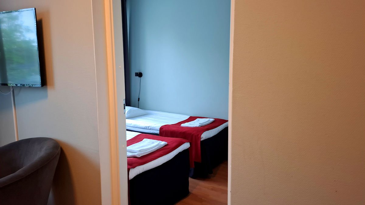 Meillä oli varattuna perhehuone Strandnäs Hotellista. Matka hotelliin kesti vajaat viisi minuuttia, vaikka se oli noin kolme kilometriä keskustasta. Periaatteessa perhehuoneessa kyse oli kaksiosta, jossa oli yksi normihotellihuone ja toinen pelkkä makuuhuone. Olimme jonkin verran ajoissa, mutta huone oli jo valmis ja pääsimme kotiutumaan heti perille päästyämme.