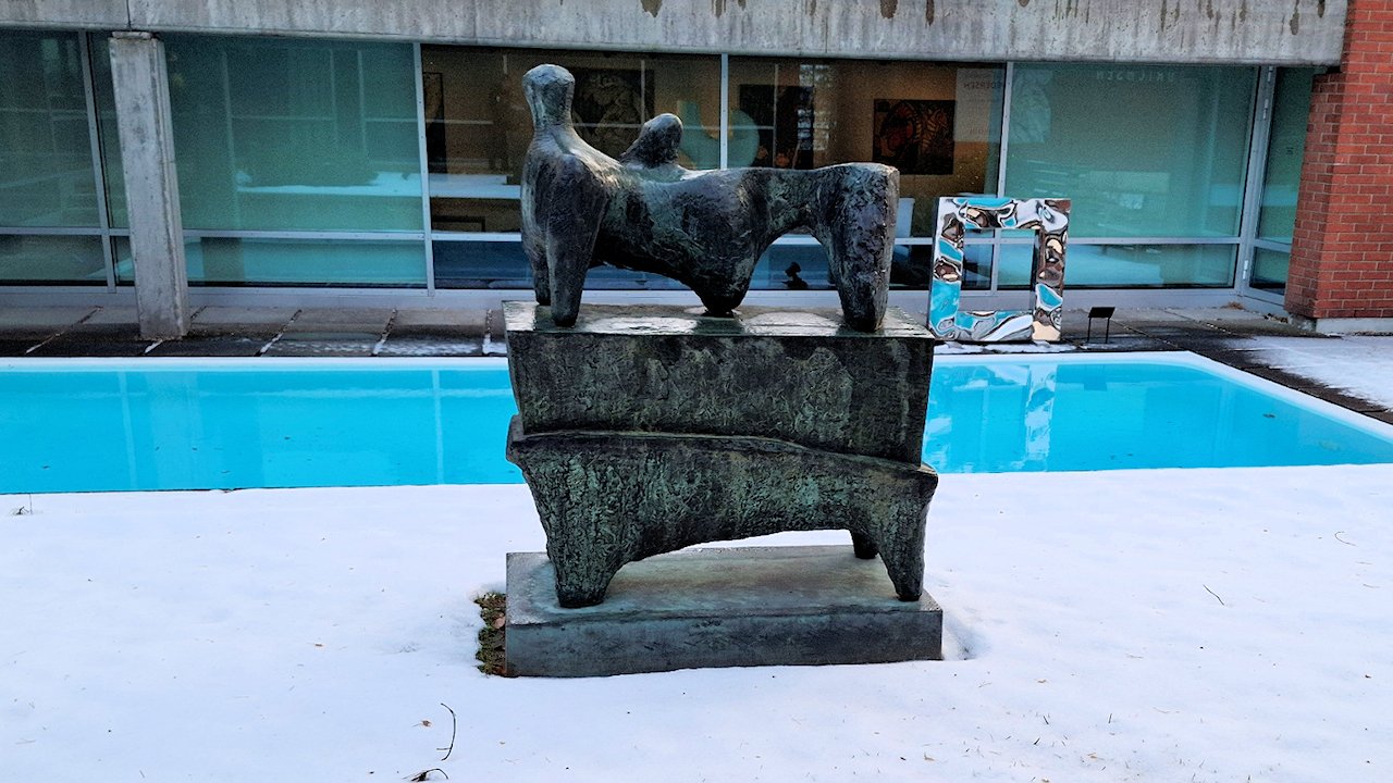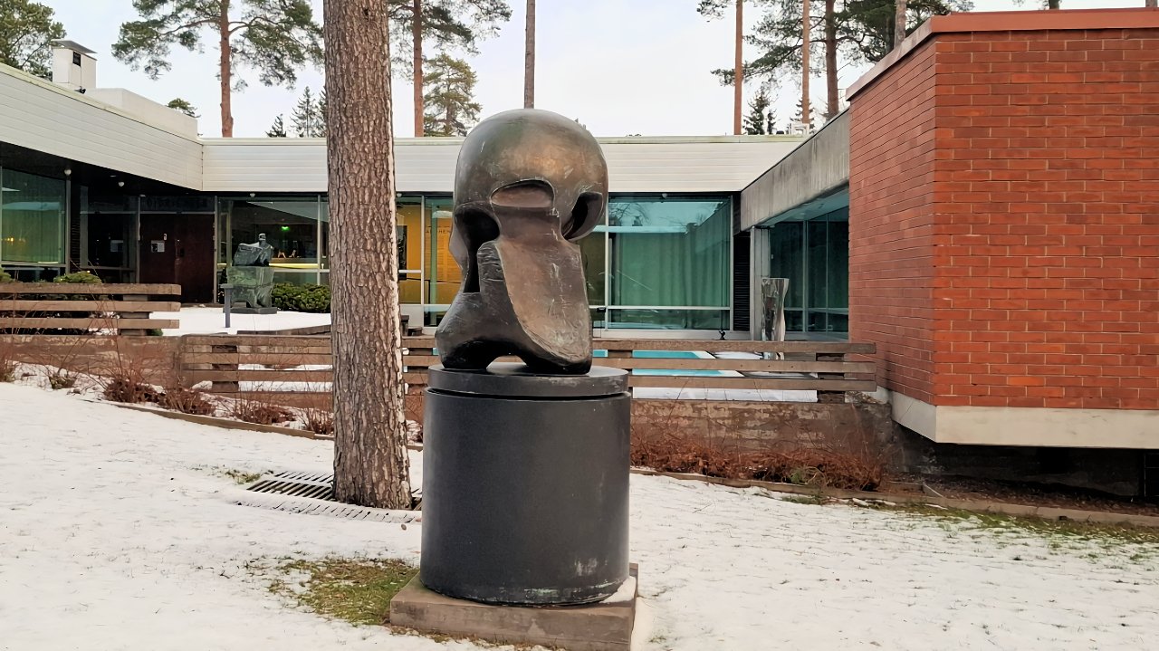 Henry Moore: The Archer 1965. Takana vasemmalla Eero Hiirosen Saari 1999 ja oikealla Henry Mooren Reclining figure on pedestal 1960