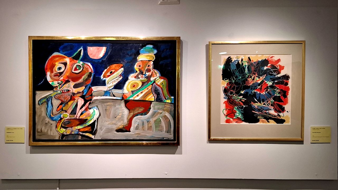Vasen taulu: Lubertus Lucebert, Fisherman’s tale 1973. Oikea taulu: Karel Appel, Paysages humains 1961
