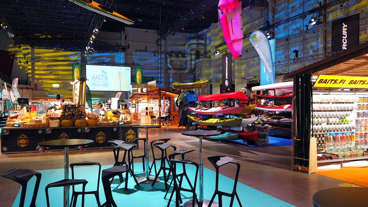 Suurin osa veneistä on halleissa 6 ja 7. Halleissa 1-2 on vesiharrasteiden esittelyjä sup-laudoista uisteluun. Suppailua voi testata Aalto-altaassa ja Perhonheittobaanalla voi kokeilla perhokalastusta tai harjoitella koukuttomalla uistimella virvelöintiä. Suurin osa aktiviteeteistakin rajoittuu juuri näihin tiloihin.