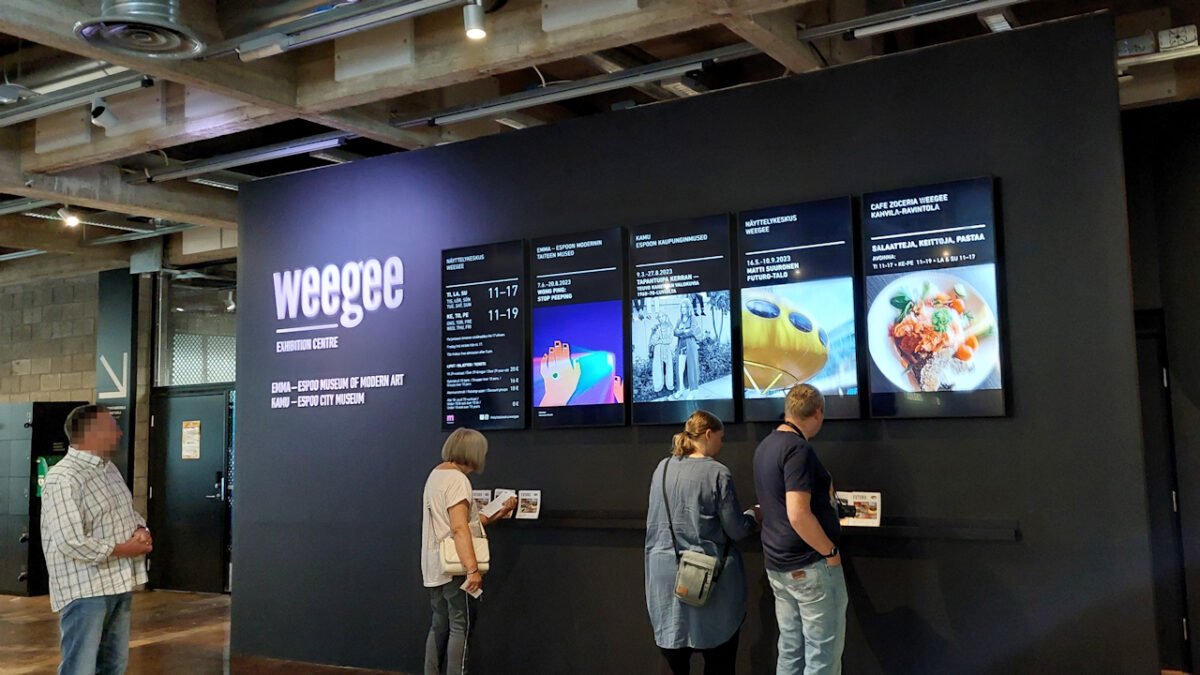 Sisääntuloaulassa on kassan lisäksi myös infotaulut, joissa kerrotaan esillä olevista näyttelyistä. Elokuussa oli tarjolla EMMAssa (Espoon modernin taiteen museo) Won Pingin Stop Peeping -näyttely, KAMUssa (Espoon kaunginmuseossa) tapahtuipa kerran -Teuvo Kanervan valokuvia 1960-70 luvuilta ja näyttelykeskus Weegeessä Matti Suurosen Futuro-talo.